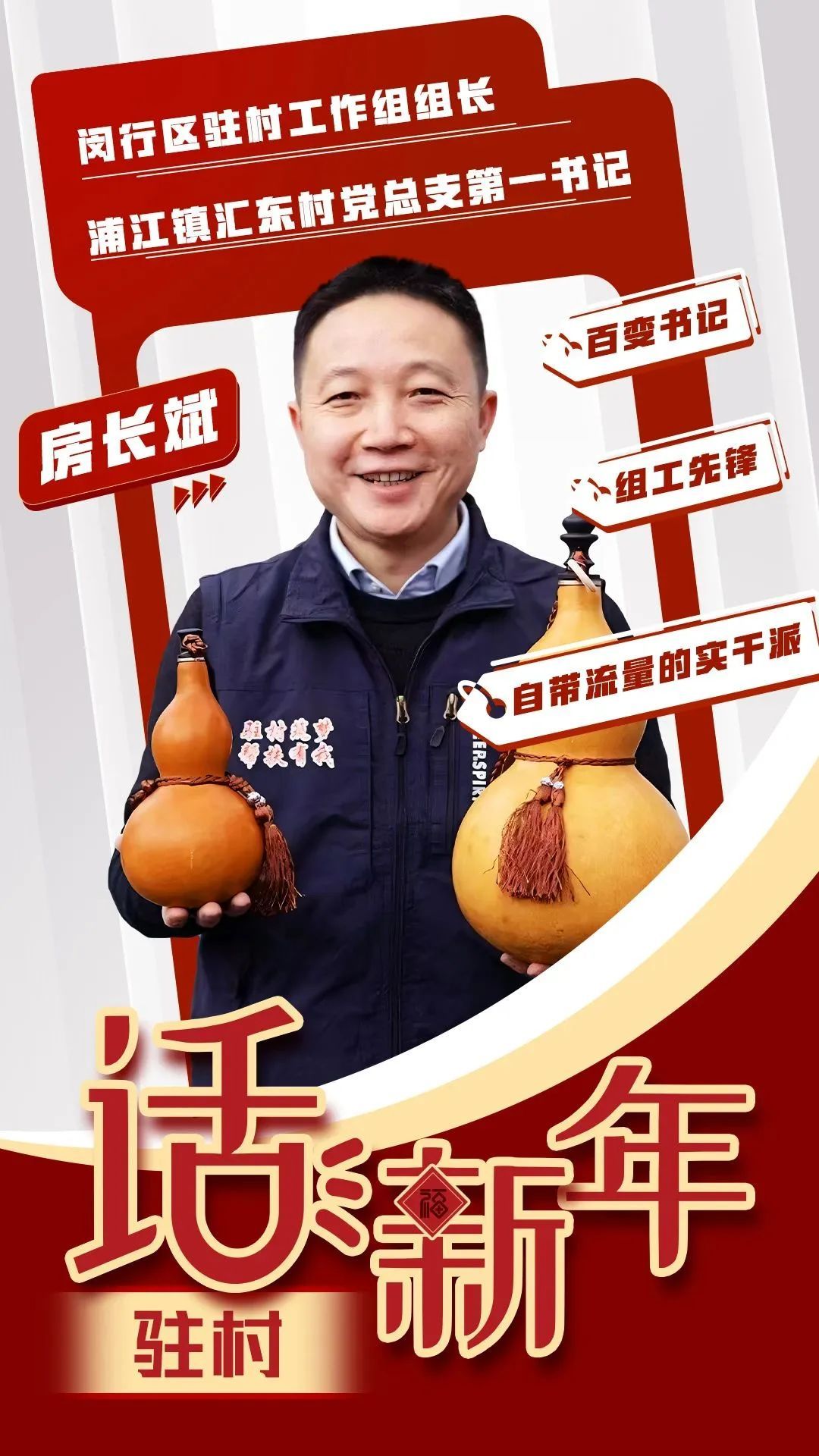 2023年7月,房长斌作为闵行区首批“驻村指导员”之一,被组织派到浦江镇挂职,担任区驻村工作组组长、汇东村党总支第一书记。那一年,为了支持新引进的葫芦企业尽快入驻,房长斌带领村工作人员,主动搬迁至高架桥下道班房办公,把村委会原办公用房腾出来,解决企业办公问题;同时,积极探索“村党总支+企业+农户”的发展模式,通过清退回购效能低的企业,发动村民参与种植、加工,合力打造“汇东四美”地区品牌,一体化解决企业办公、生产销售、品牌培育等问题。如今,汇东村“葫芦村”的名头越喊越响,房长斌也被人们亲切地称为“葫芦书记”。组织优势不只是给你一道 “光环”,更是让你打靶“十环”,这里欢迎的是“接地气、懂基层、有办法”的干部,基层干事创业拼的更是“思路、资源、人品”。
