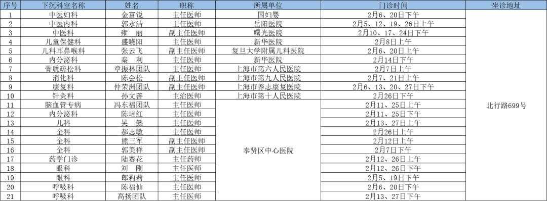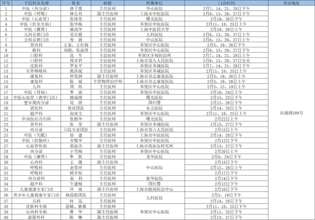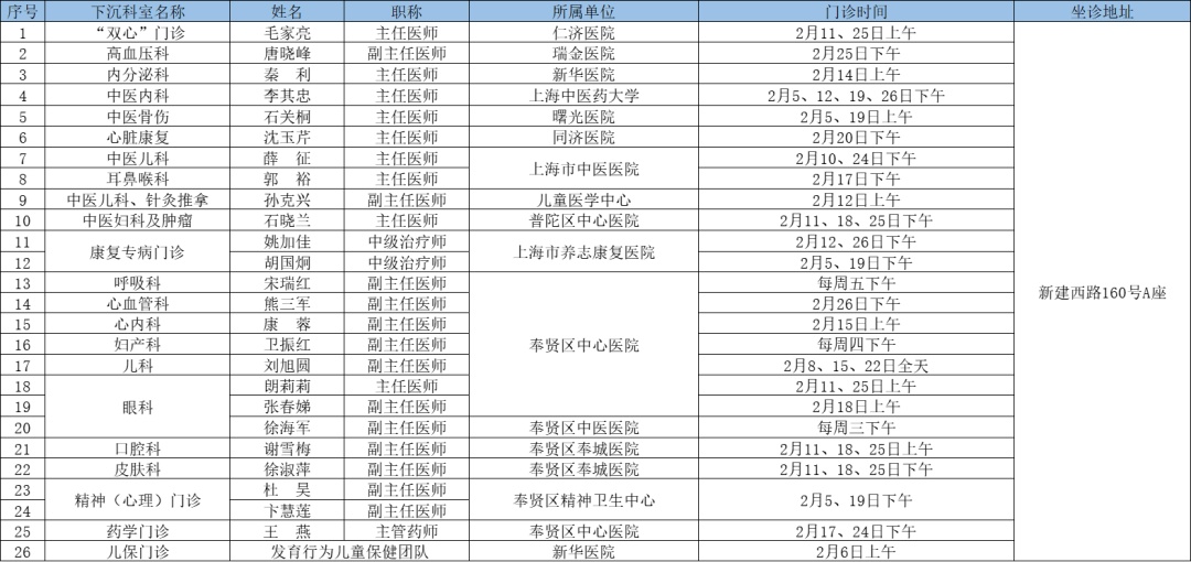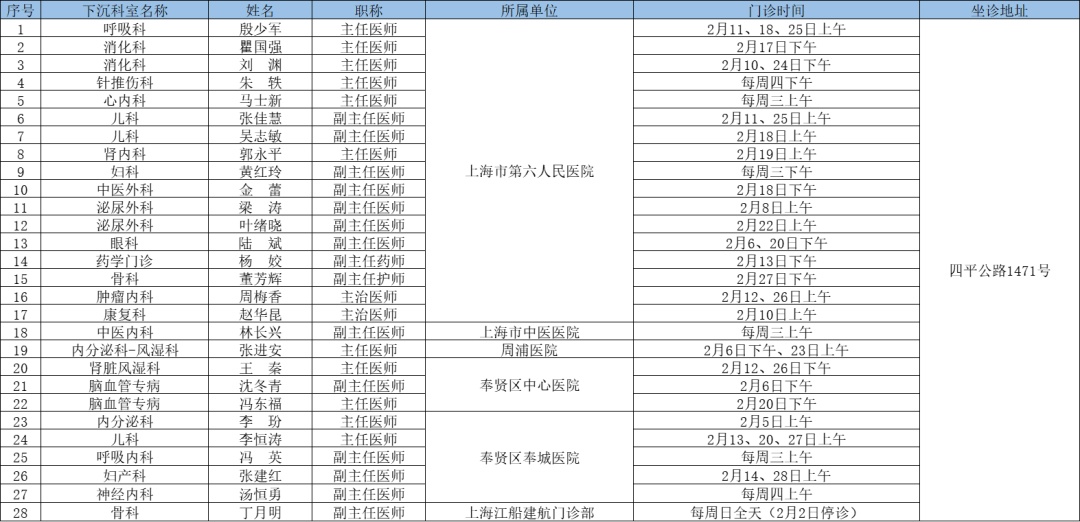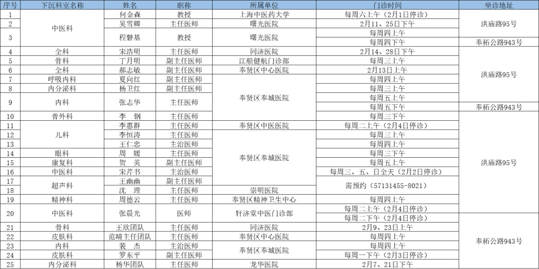 二三级优质资源下沉社区 为切实解决百姓家门口看病难问题、促进优质医疗资源下沉,提升居民健康管理水平,在市属医院、区级医联体单位的支持下,奉贤区现开展“上级医院优质医疗资源下沉社区”门诊,2025年2月份门诊时间一览见下表: 南桥镇社区卫生服务中心 南桥镇光明社区卫生服务中心 奉城镇社区卫生服务中心 头桥社区卫生服务中心 庄行镇社区卫生服务中心 庄行镇邬桥社区卫生服务中心 柘林镇社区卫生服务中心 金汇镇社区卫生服务中心 金汇镇泰日社区卫生服务中心 青村镇社区卫生服务中心 四团镇社区卫生服务中心 四团镇平安社区卫生服务中心 海湾镇社区卫生服务中心 西渡街道社区卫生服务中心 奉浦街道社区卫生服务中心 金海社区卫生服务中心 *以上内容仅供参考,具体出诊安排请关注各社区卫生服务中心微信公众号。