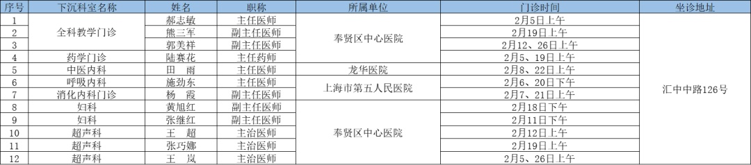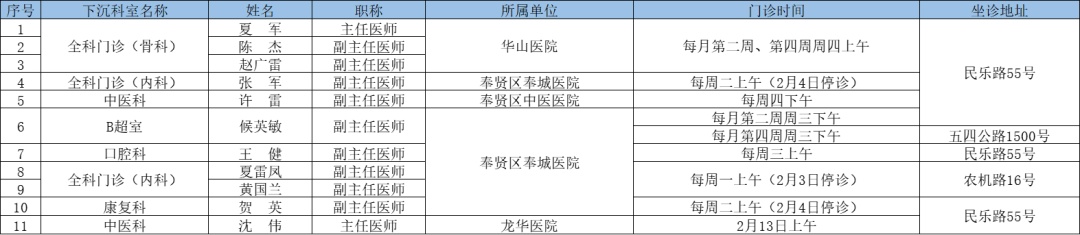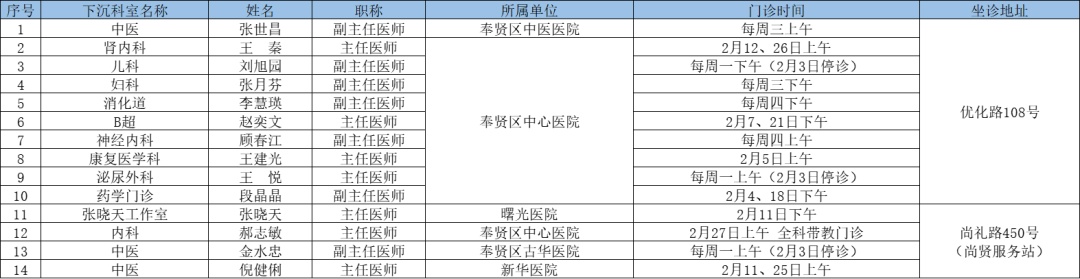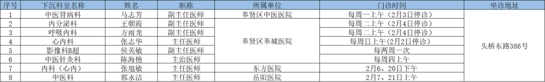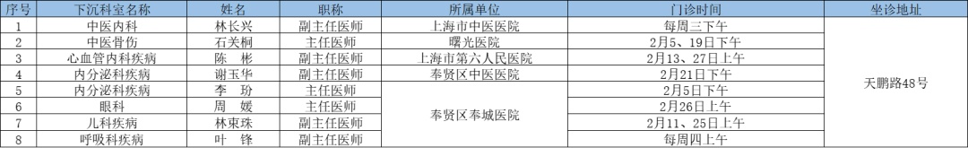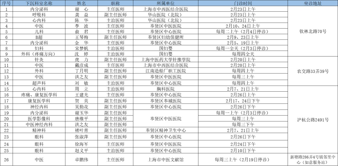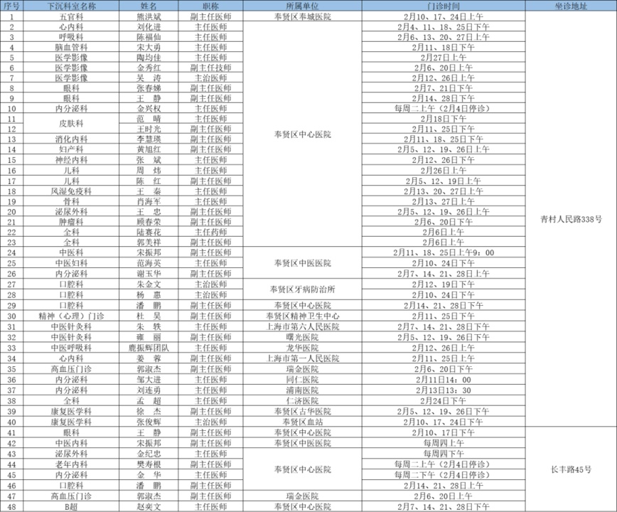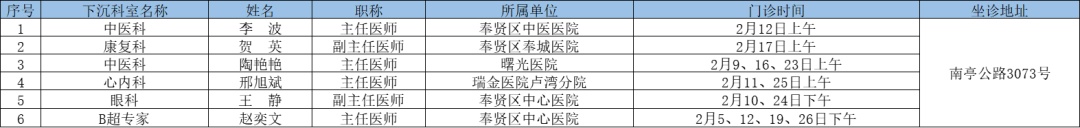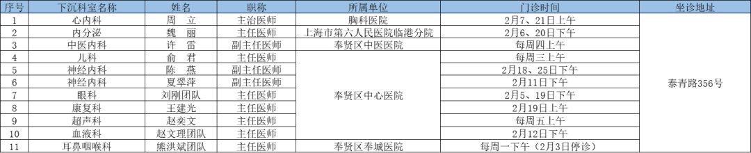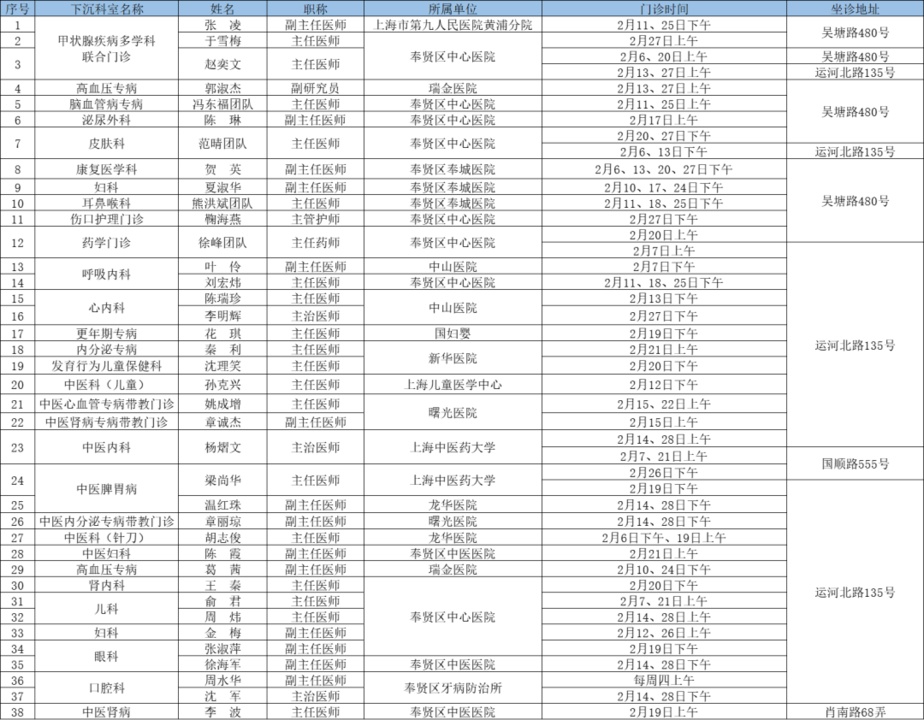 二三级优质资源下沉社区 为切实解决百姓家门口看病难问题、促进优质医疗资源下沉,提升居民健康管理水平,在市属医院、区级医联体单位的支持下,奉贤区现开展“上级医院优质医疗资源下沉社区”门诊,2025年2月份门诊时间一览见下表: 南桥镇社区卫生服务中心 南桥镇光明社区卫生服务中心 奉城镇社区卫生服务中心 头桥社区卫生服务中心 庄行镇社区卫生服务中心 庄行镇邬桥社区卫生服务中心 柘林镇社区卫生服务中心 金汇镇社区卫生服务中心 金汇镇泰日社区卫生服务中心 青村镇社区卫生服务中心 四团镇社区卫生服务中心 四团镇平安社区卫生服务中心 海湾镇社区卫生服务中心 西渡街道社区卫生服务中心 奉浦街道社区卫生服务中心 金海社区卫生服务中心 *以上内容仅供参考,具体出诊安排请关注各社区卫生服务中心微信公众号。