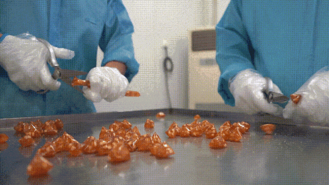 选料、溶糖过筛、手工熬制、出锅冷却、拌入果料、翻叠凝固、捉条剪型……遵循古法制成的粽子糖,每一步都离不开人工的把控,是机器无法复制的美味。