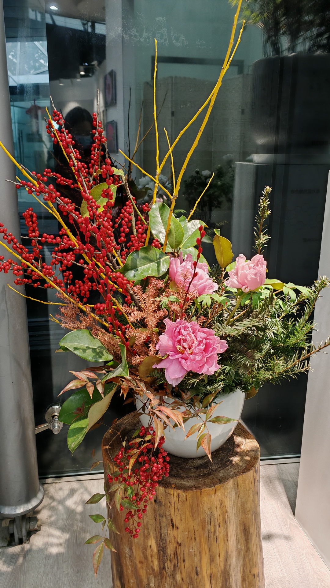 这两盆作品以红色为主基调,运用红彤彤的北美冬青果和南天竹果及红色喜庆吉祥如意节为主体,加上硕大无比的西瓜红色牡丹花,体现出牡丹的雍容华贵和国色天香。作品整体表达出牡丹艳冠群芳,唯有牡丹真国色,花开时节动京城的盛景,彰显着新一年生活似牡丹花般绚丽多彩,元气满满。