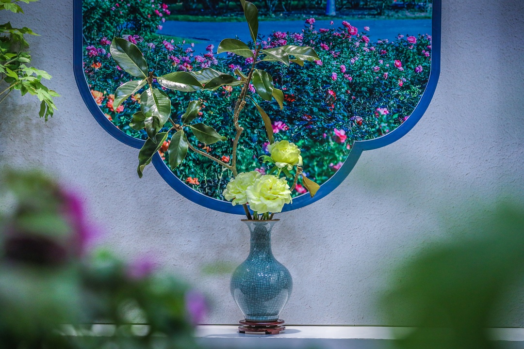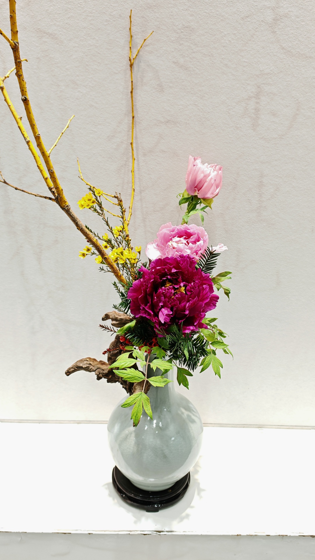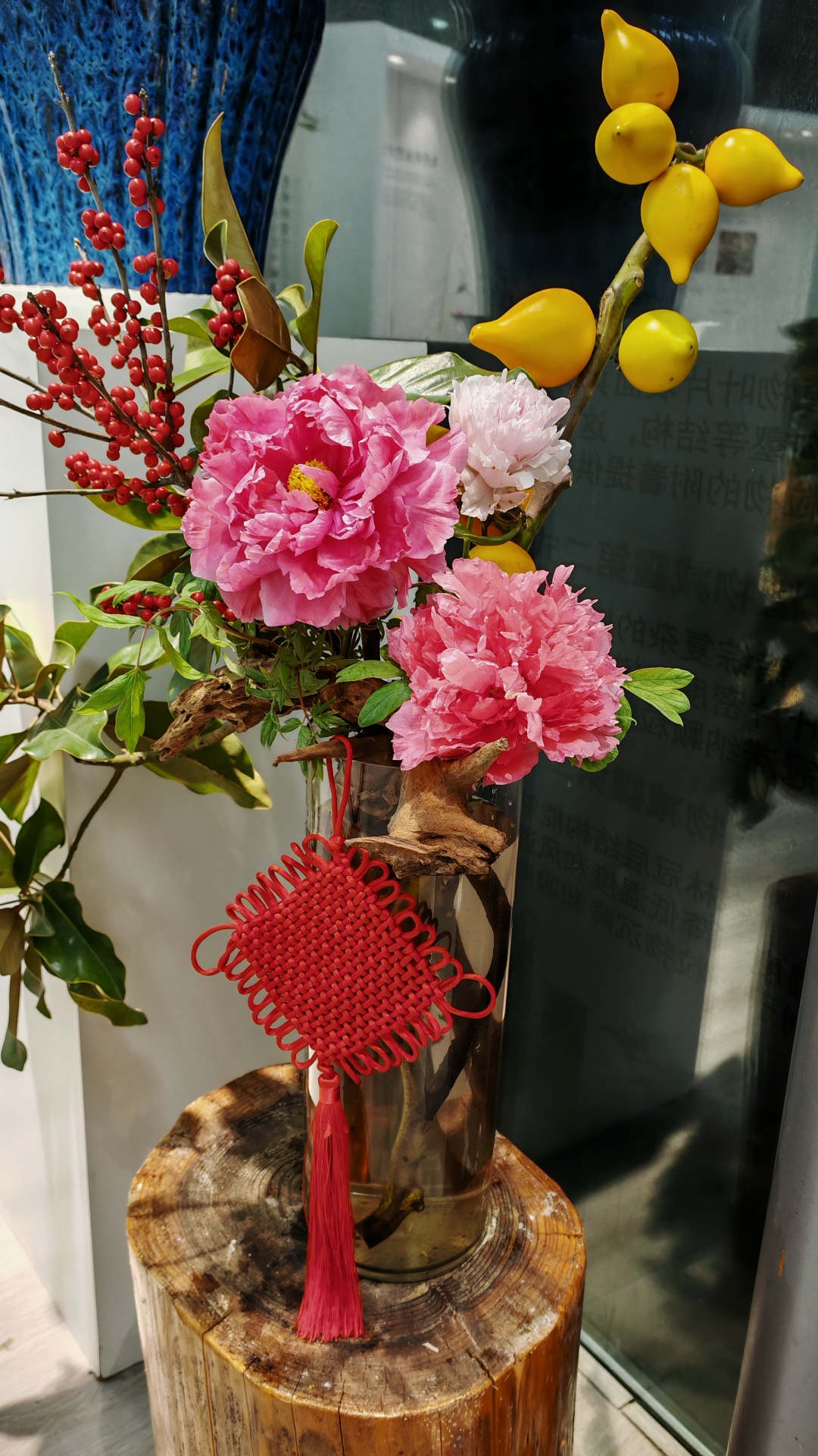 此次牡丹艺术插花以雍容华贵的牡丹作为主花材,辅以喜庆花材,充分体现春节喜气洋洋的热闹景象。此次花艺作品花器主要运用中国传统插花六大花器中的“瓶”,瓶花作品通常以表现花材线条美感为主,重点体现出牡丹花自然状态下高雅的美态;同时,“瓶”与“平”同音,取其平安吉祥之意。