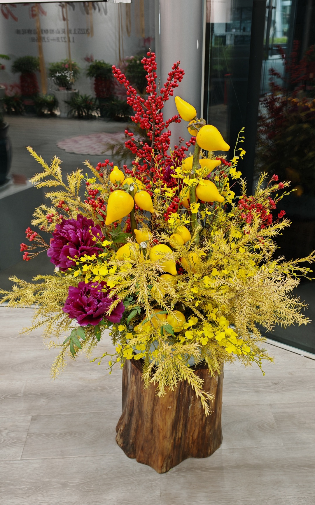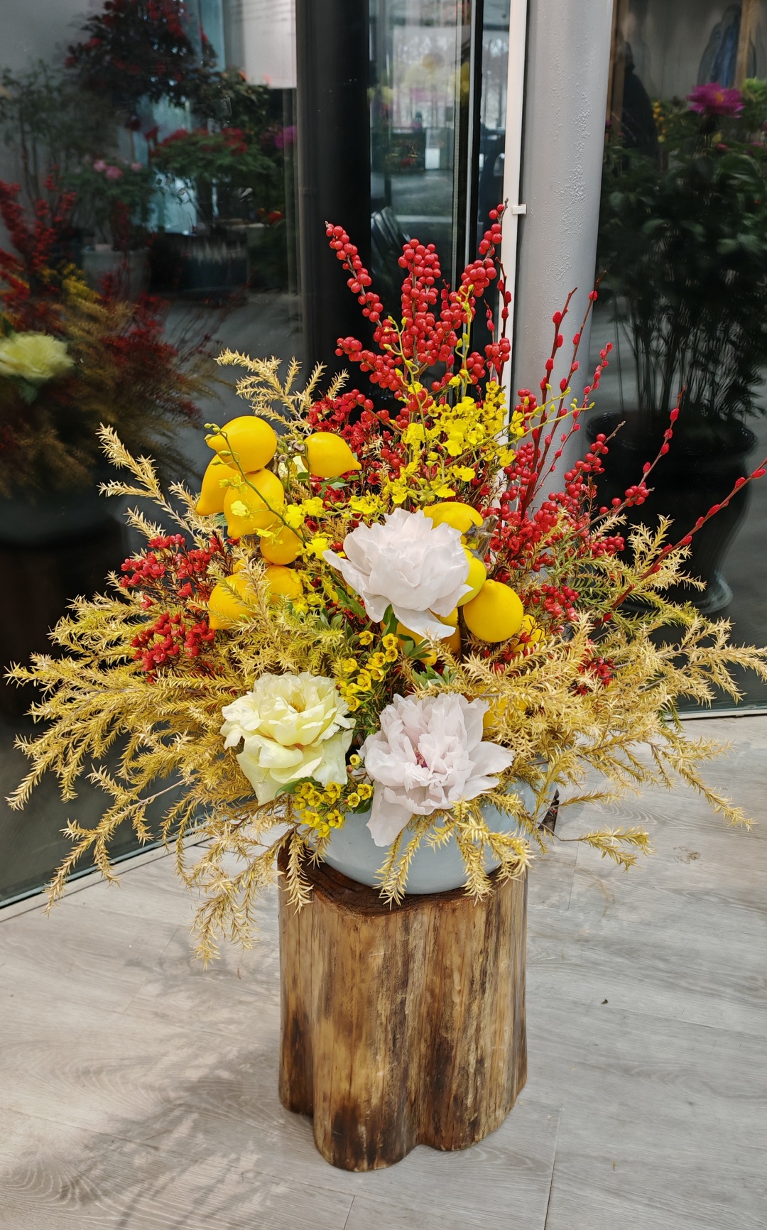 进门两盆花艺作品以金色为主基调,以金灿灿的五代果为主体,结合丝绒般质感的紫红色牡丹花和贵气逼人的金黄色牡丹花,作品整体表达着新春佳节富贵吉祥,福气满满,年年如意的美好愿景。
