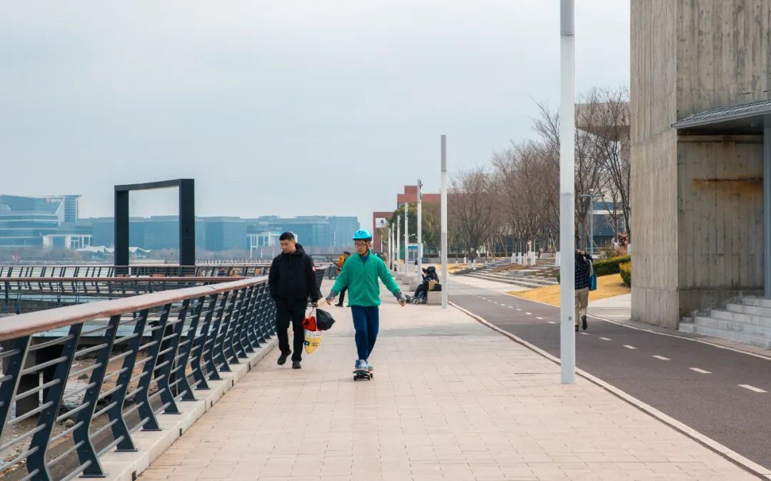 午后的滨江俨然化身“城市健身房”,骑行者穿梭于彩色沥青跑道,也有脚踏滑板的青年在碗池中翻转,轮滑爱好者们沿着波浪形坡道轻盈穿梭,攀岩墙、篮球场等户外运动设施前聚集着挥洒汗水的市民。“这里设施专业、氛围自由,孩子们在春节假期也能有别样的户外体验。”市民林先生说道。