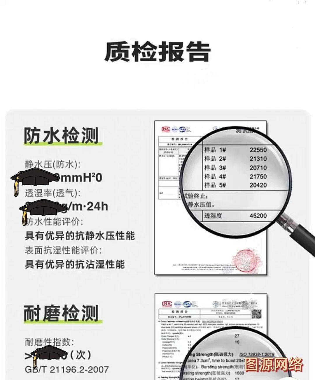 3.看防水性:查看产品检测报告上的防水指数和防沾水等级。选标注高防水指数的。