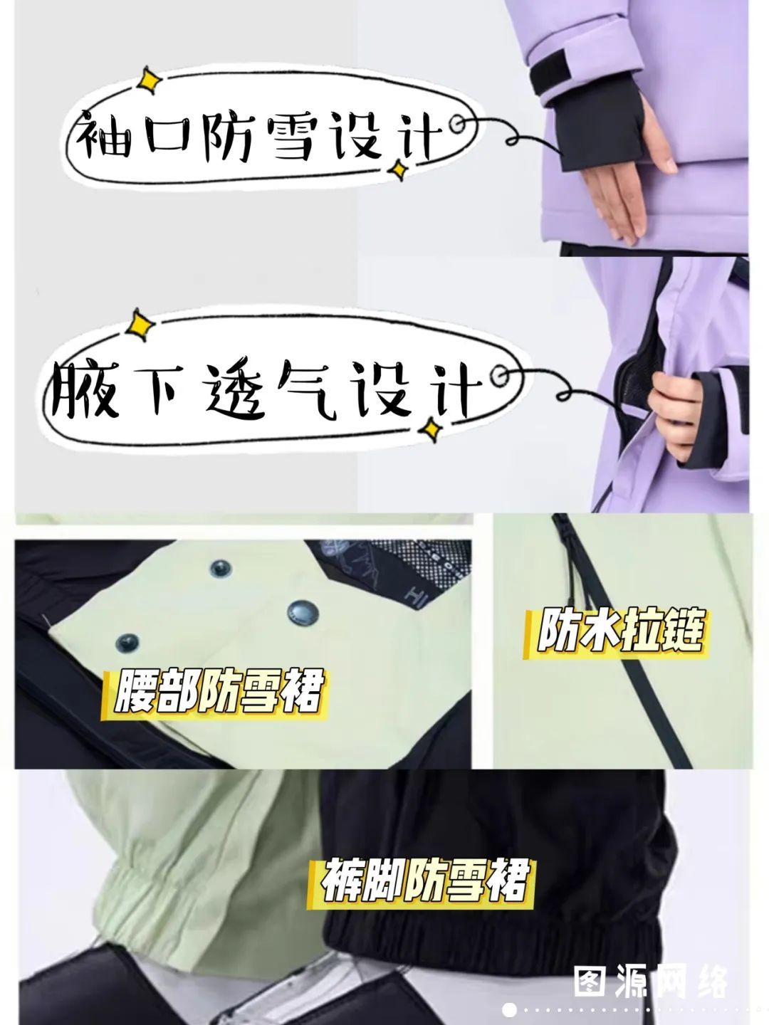 6.看安全结构设计:选有防风防雪设计的,试穿时感受领口、袖口等缝隙处,风难灌入为宜。此外,还应关注色彩和反光元素。选择色彩鲜艳、图案醒目的,或者在衣服的正面、背面、袖口等位置添加反光条或反光图案的。比如明亮的红色、黄色、橙色等色彩,就像雪地上的信号灯,这样的设计更容易被教练和其他滑雪者注意到,降低碰撞的风险,对于在滑雪场上的安全有着重要意义。