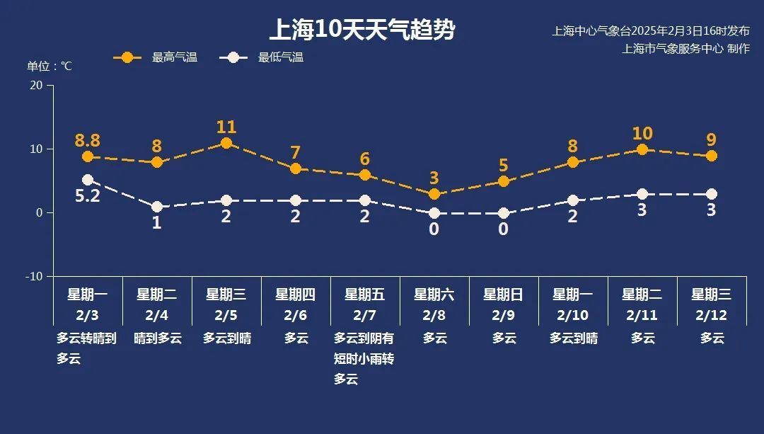 受地面高压控制,周三周四,上海以多云到晴天气为主,有利于返程和节后复工。早晚气温还是很低,市区只有2℃左右,郊区在零下5℃到零下3℃之间。周三白天为近期最暖,最高气温接近11℃。周后期受较强冷空气影响,将会出现大风降温过程,并伴有短时小雨,请大家及时关注最新的天气预报信息。