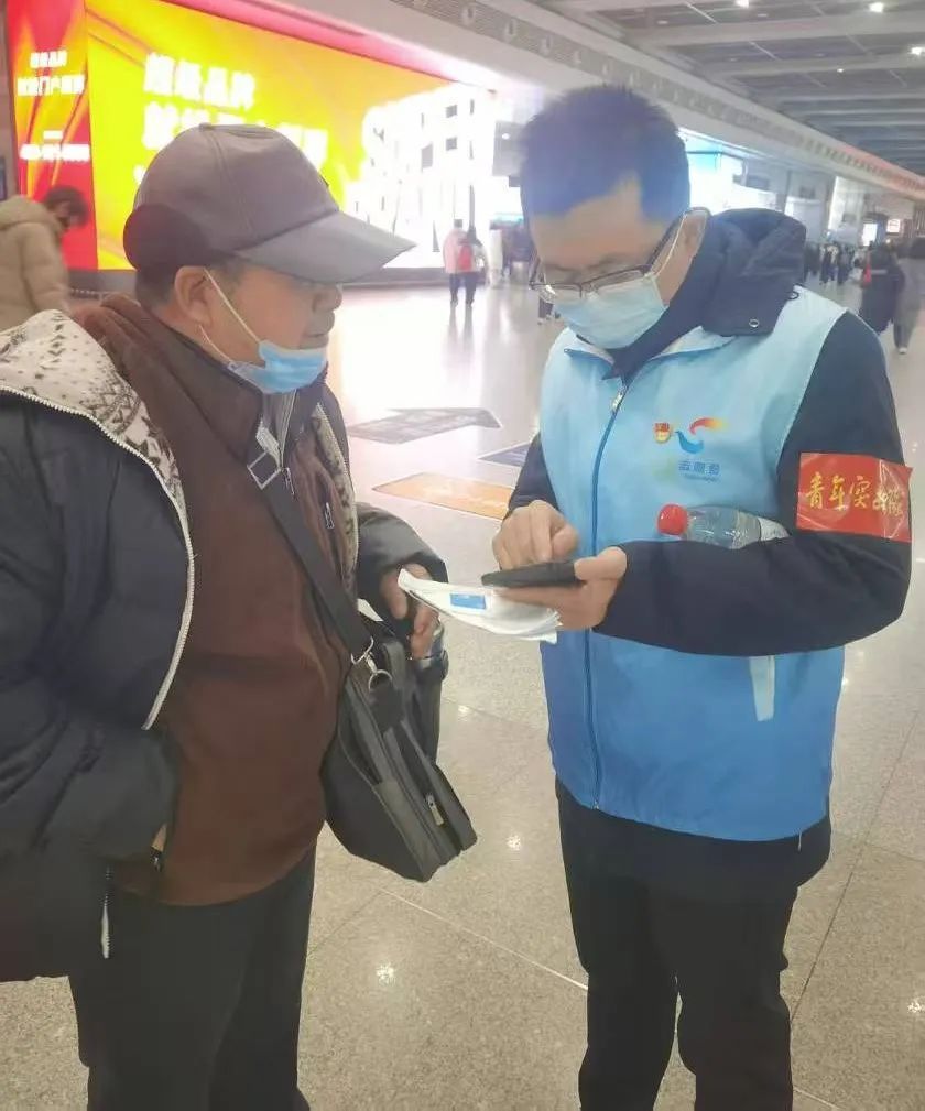 老人操着方言,拿着一份写有地址的信封,言语中透露出些许无助。通过认真查看信封,寇晓东很快了解到老人要去的是徐汇区钦州路900号的钦州花苑小区,便为其规划了科学合理的地铁换乘路线:虹桥火车站乘坐10号线到虹桥路站换乘3号线再到宜山路站8号口出步行1.4公里即达。为了让老人减少忧虑,寇晓东带着老人到地铁售票机帮忙买了地铁票,并送到地铁进站口,再次叮嘱了换乘路线,目送老人进站后才放心离开。当天,寇晓东还遇到了几个不会电子购票、使用乘车码的外地旅客,他都一一耐心为他们指导完成购票、开通手机地铁乘车二维码。当一声声的“谢谢”传来时,也让寇晓东深深地感受到了志愿服务的温暖与力量。党员志愿者贾洪岩逐渐融入了这片忙碌而有序的场景。面对旅客们的各种需求,贾洪岩耐心解答、细心指引,从购票进站到安检上车,每一个环节都力求做到尽善尽美。