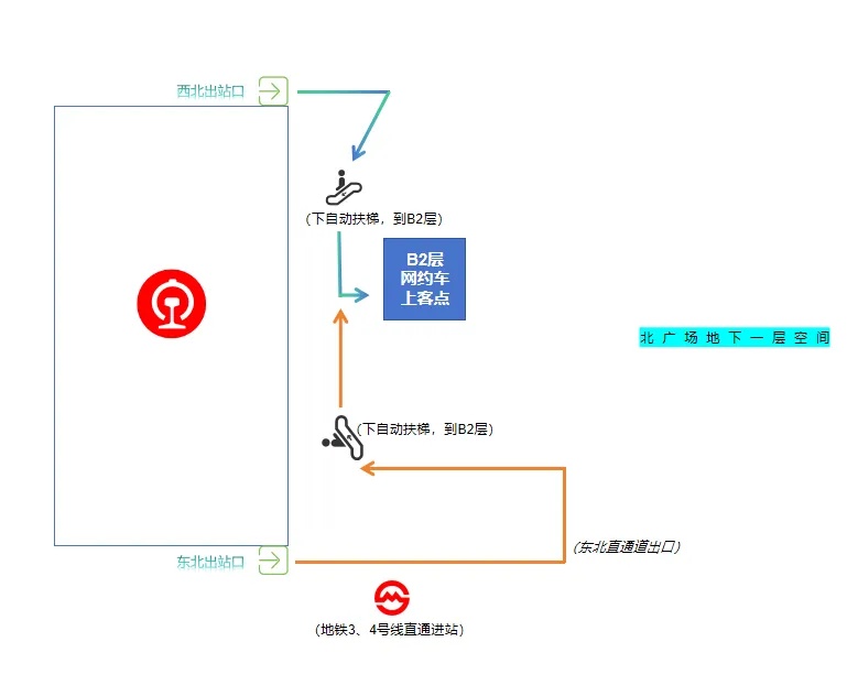 前往地铁3、4号线西侧进站口(北广场B1层)