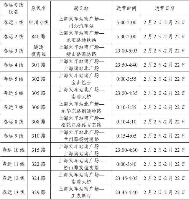 (二)春运期间,本市交通部门开辟了29 条春运公交专线,其中上海站地区有13条春运专线,详情如下,供大家参考⬇️