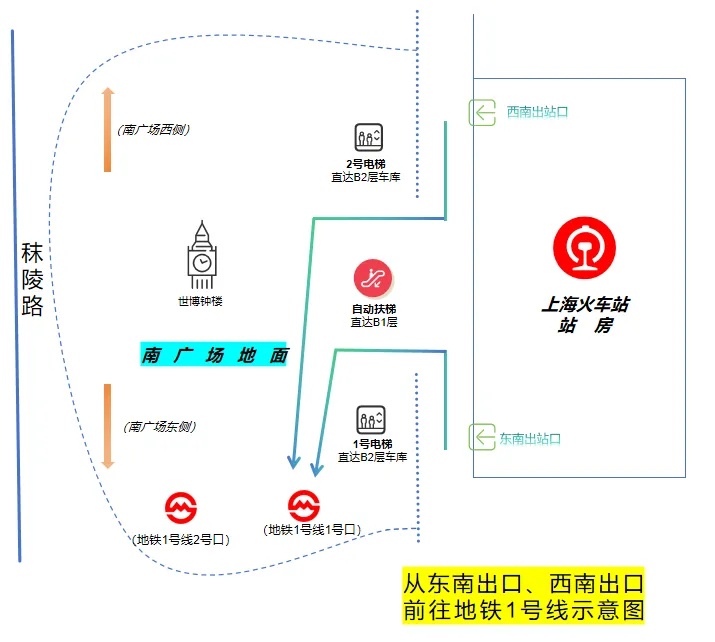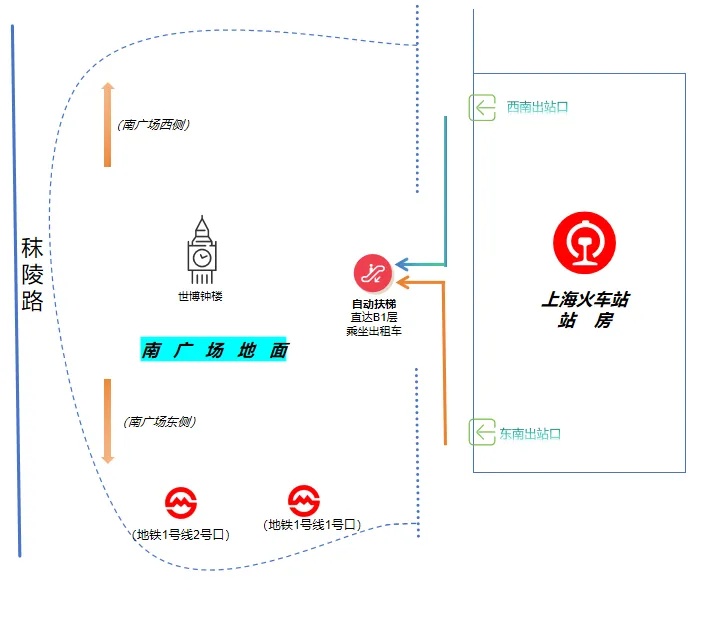如果您需要到上海站南广场,请从上海站东南出站口、西南出站口出站。