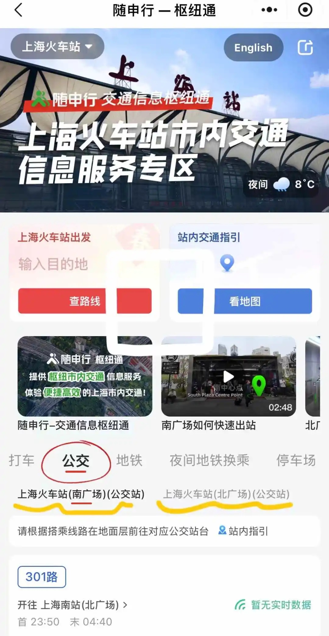 (一)如您到站后计划乘坐公交车,建议提前通过地图软件搜索站点方位前往路线,或者通过“随申行-枢纽通”小程序,快速查找公交站点等准确信息,非常精准。