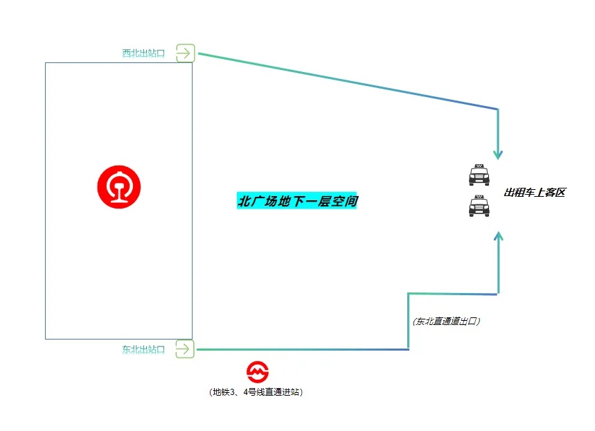 北广场出站后前往出租车候车区路线示意图