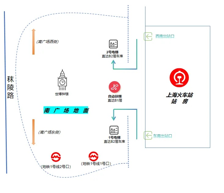 上海站东南出口、西南出口出站以后,可通过南广场上东面1号直达梯、北面2号直达梯,或者通往出租车候车区的中心扶梯,到达南广场B2地下停车区域。