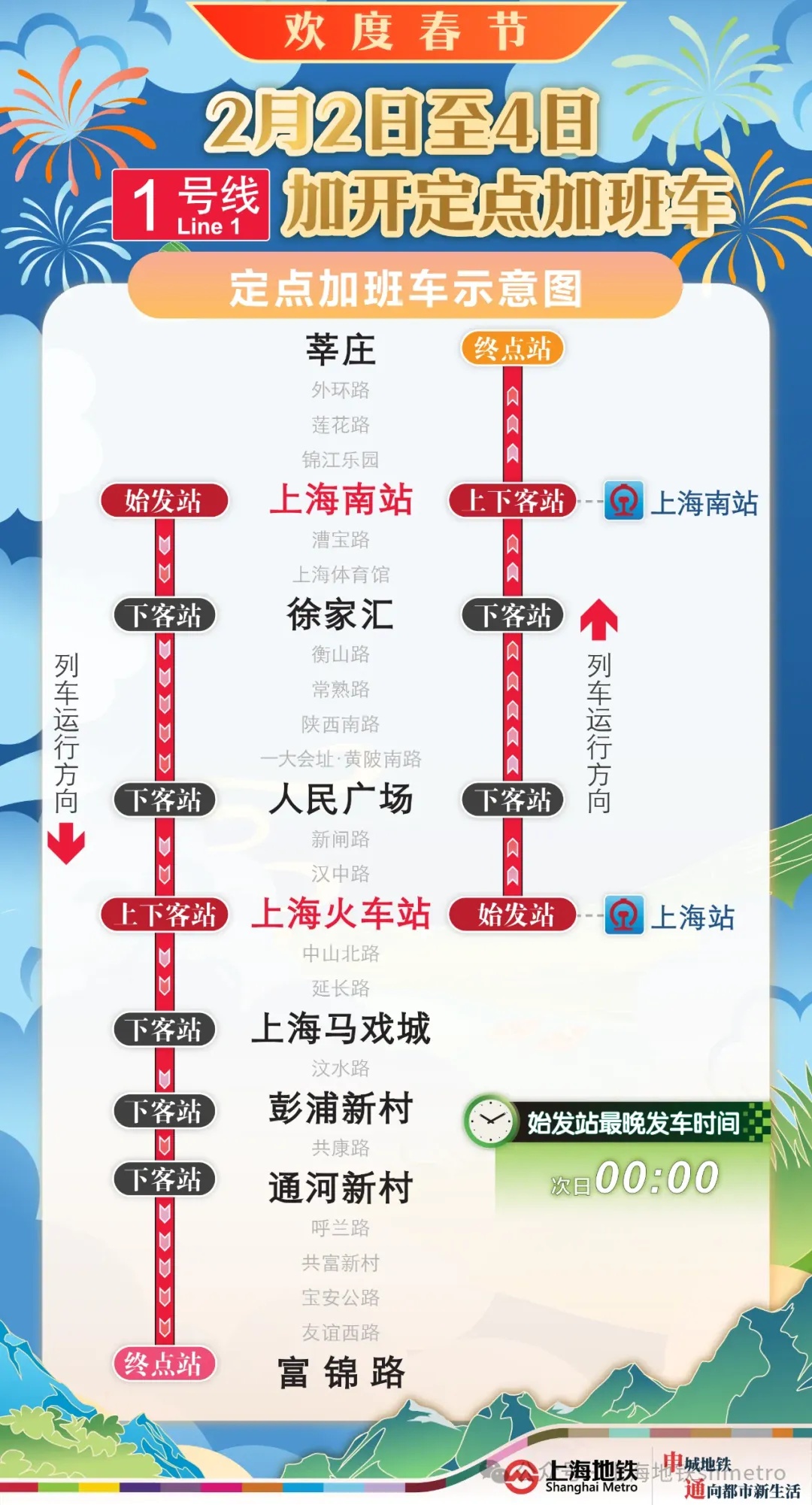 地铁1号线上海南站站往富锦路站方向:在上海南站站末班车(22:42)后加开4列定点加班车运行至富锦路站,加班车停靠上海南站站、徐家汇站、人民广场站、上海火车站站、上海马戏城站、彭浦新村站、通河新村站、富锦路站(终点站),其余车站跳停。停靠车站中,上海南站站(始发站)、上海火车站站办理上下客,其余车站只下不上。