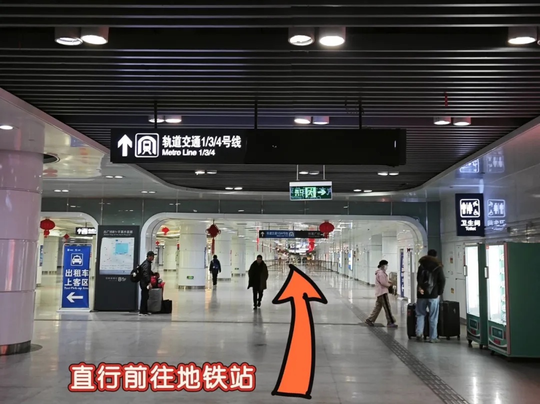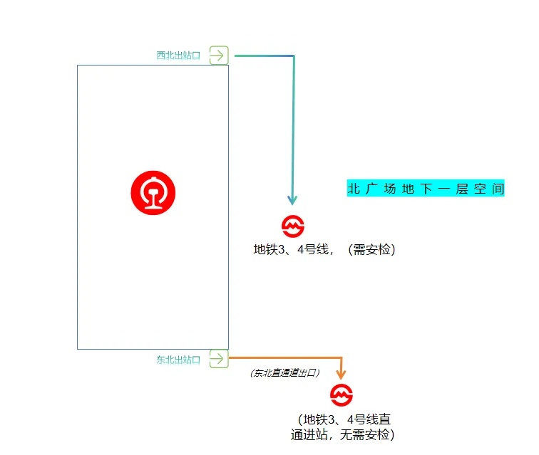出站以后,顺着通道向前走,向右即可到达地铁3、4号线售票区及进站闸机,无需进行再次安检;无换乘地铁需求的旅客则可沿该通道继续向前走,向左离开换乘区,完成出站。