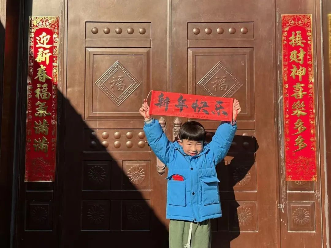 新年为老房贴上新对联,孩子在阳光下被晒得睁不开眼,但是口袋里的红包还是让他笑开了怀~