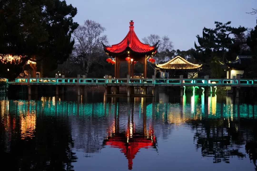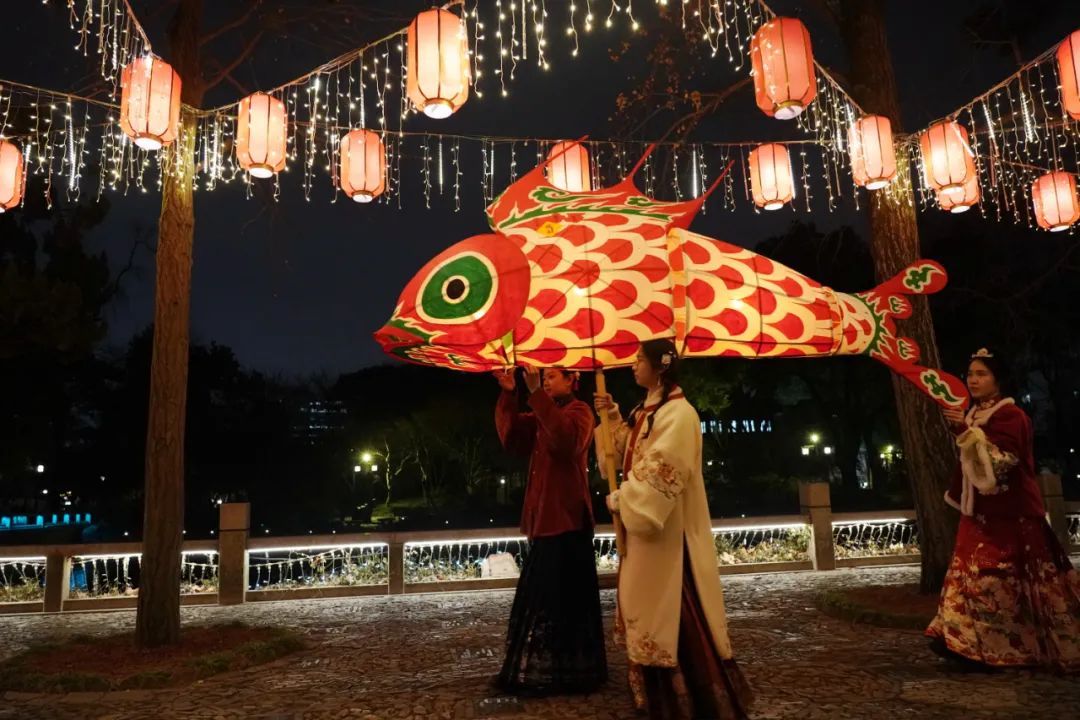 夜幕降临,古猗园亮灯了,九曲桥在彩灯装扮下分外喜庆、流光溢彩。安徽歙县特有的鱼灯巡游在古猗园里呈现,身穿汉服的姑娘们举着鱼灯在园中穿行。