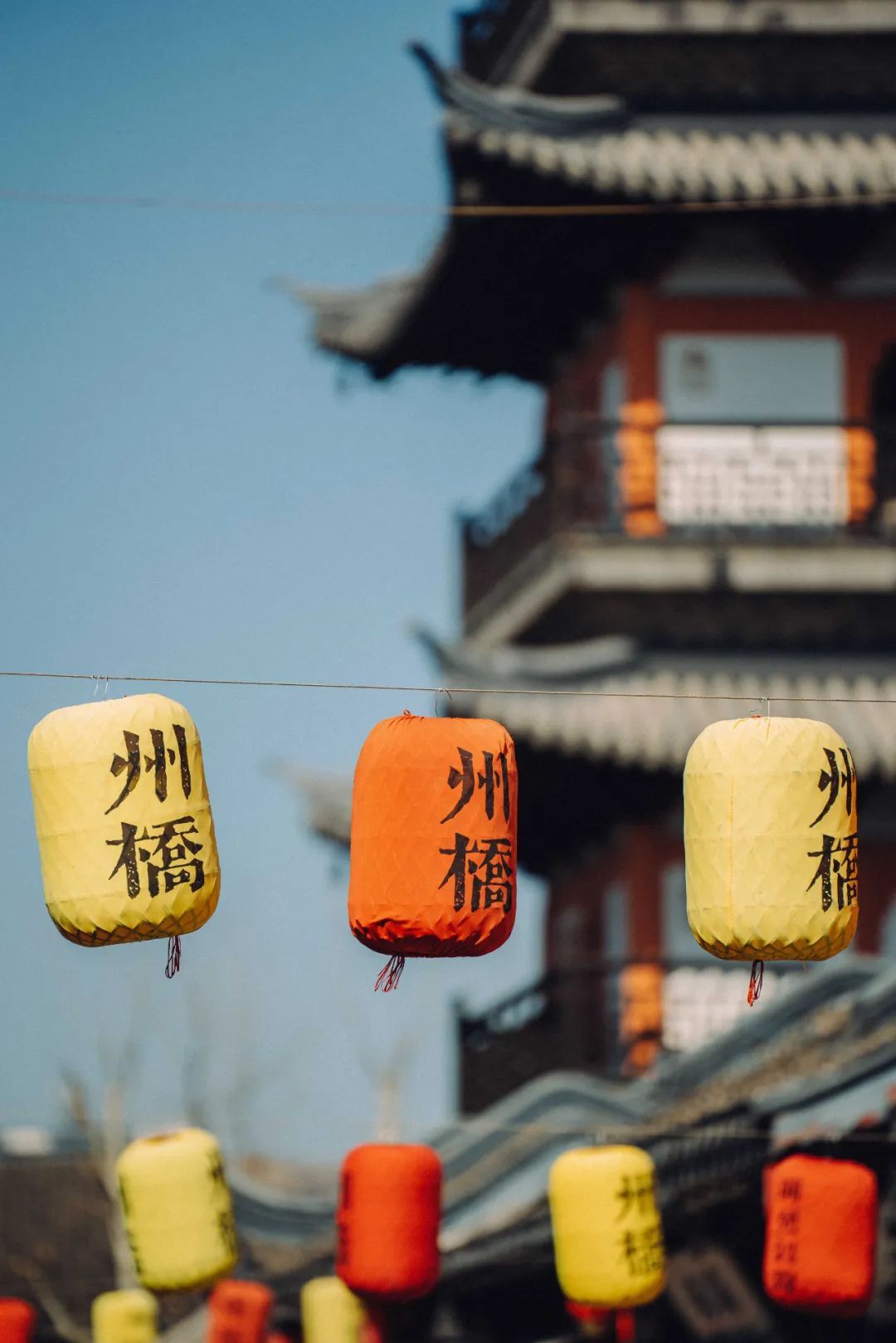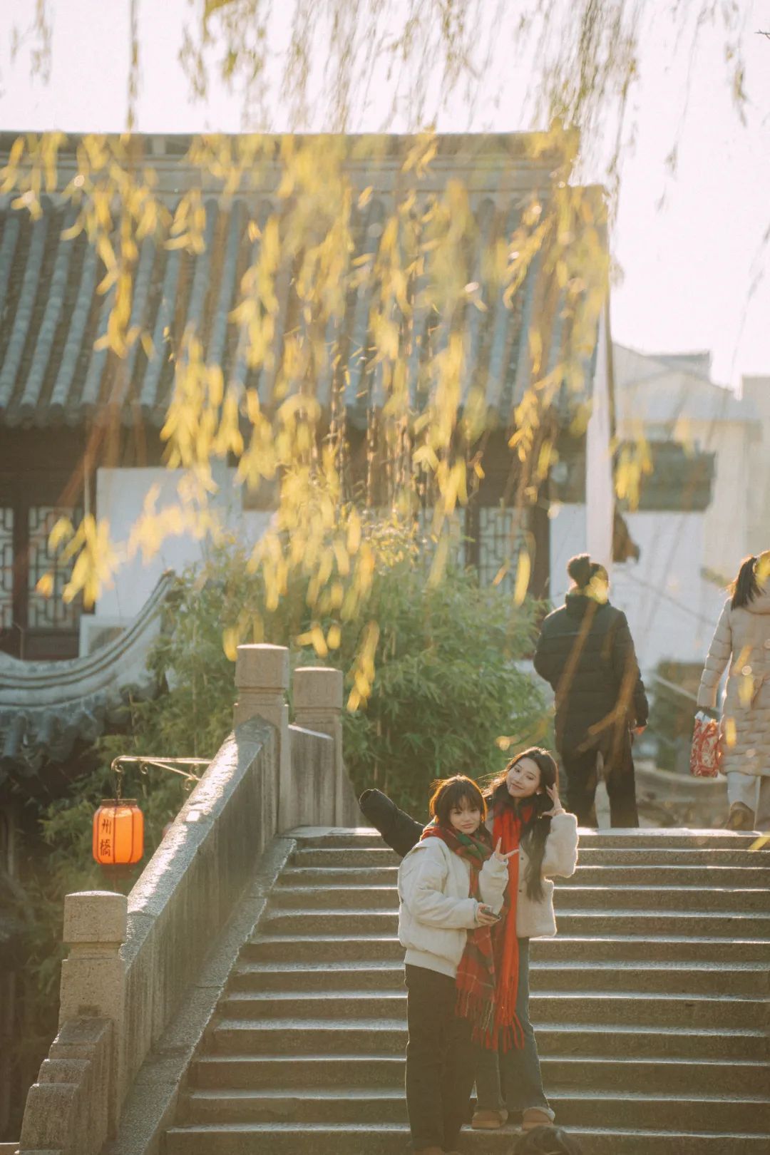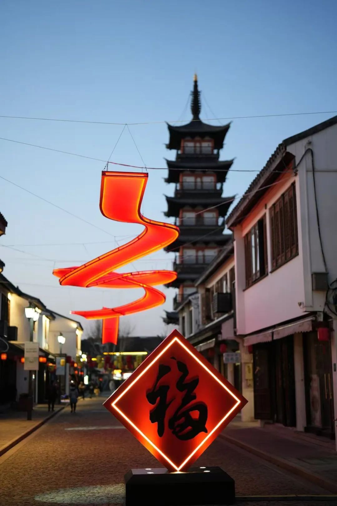 新春佳节的嘉定州桥老街,绯色浪潮在白墙黛瓦间流淌。飞檐翘角悬着的红灯笼随风轻摇,阳光倾洒在老街的弹硌路上,游客们或穿着红色新衣,或围着红色围巾,在法华塔下拍照打卡。
