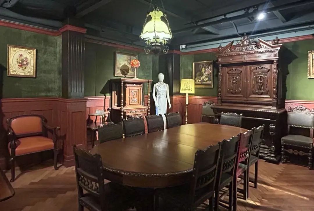 走进“乍浦锦里”,底层南侧的咖啡馆弥漫着浓郁的咖啡香气。二楼被巧妙布置为展示厅,宽敞的空间里,艺术品、古董家具、老物件以及各种款式的蔓楼兰旗袍琳琅满目,让人目不暇接。