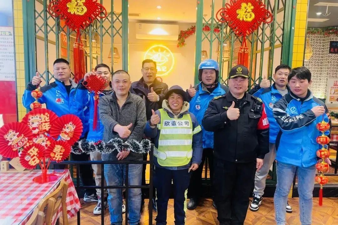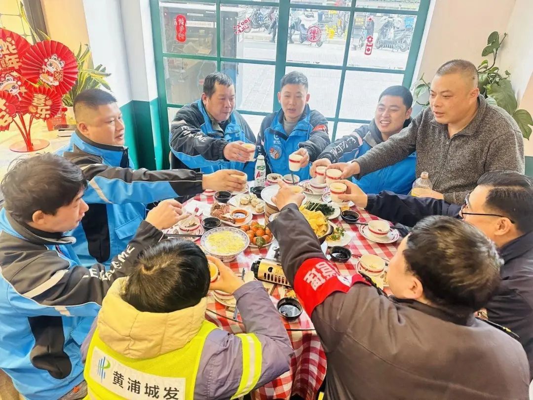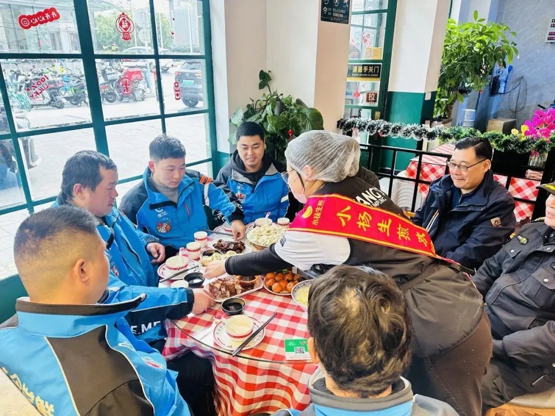 餐桌上摆放得满满当当,留守的环卫工人、特保队员和小区物业也加入其中,一起享受美食,感受年味,浓得化不开的温馨氛围让每个人的脸上都洋溢着笑容,化解了一年的辛劳,取而代之的是对新一年的期许。