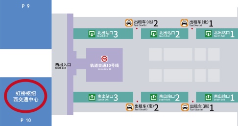 交通攻略 假期余额不足!你是否已在返程路上了?乘火车抵达虹桥火车站的旅客,如何快速离开?地铁、市域铁路如何换乘?出租车、公交分别在哪里候车?交通攻略来啦→ 位置分布 虹桥火车站到达层共有6个出口,分别是:南出站口1、南出站口2、南出站口3、北出站口1、北出站口2、北出站口3,具体方位、出站口如图所示↓ 轨道交通 1 从南出站口1、北出站口1出来的旅客 可选择在虹桥火车站站乘坐轨道交通2号线、10号线、17号线,或选择在虹桥2号航站楼站乘坐轨道交通2号线、10号线; 2 从南出站口2、南出站口3、 北出站口2、北出站口3出来的旅客 可选择在虹桥火车站站乘坐轨道交通2号线、10号线、17号线。 线路图 1 虹桥火车站站 轨道交通2号线 轨道交通10号线 轨道交通17号线 出站后,自东向西走↑
