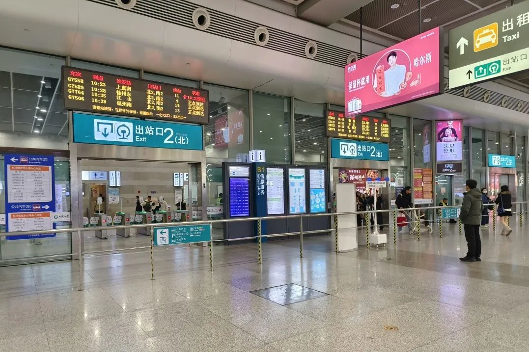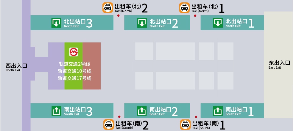 从南出站口2、北出站口2出来的旅客,可选择在出租车南1、出租车南2、出租车北1、出租车北2乘坐出租车;