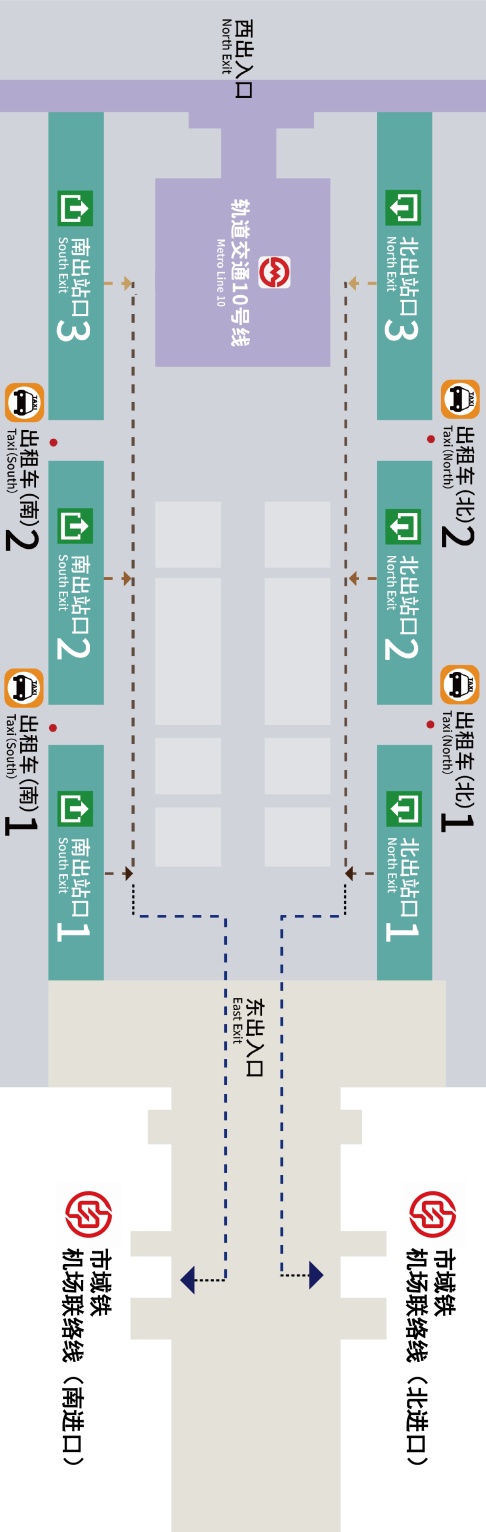 若从南出站口1、北出站口1出站,步行约150米,即可到达市域铁路的进站口。