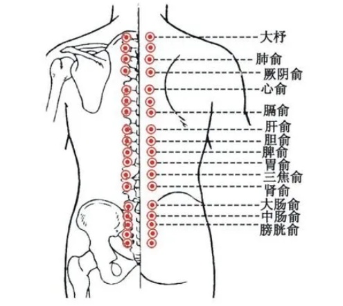 穴位:大杼、肺俞、风门、厥阴俞、心俞、督俞、膈俞、肝俞、胆俞、脾俞、胃俞、三焦俞、肾俞、气海俞等膀胱经穴位。