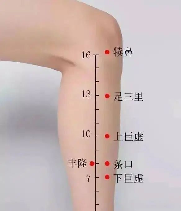 穴位:内关、足三里、上巨虚、下巨虚、合谷
