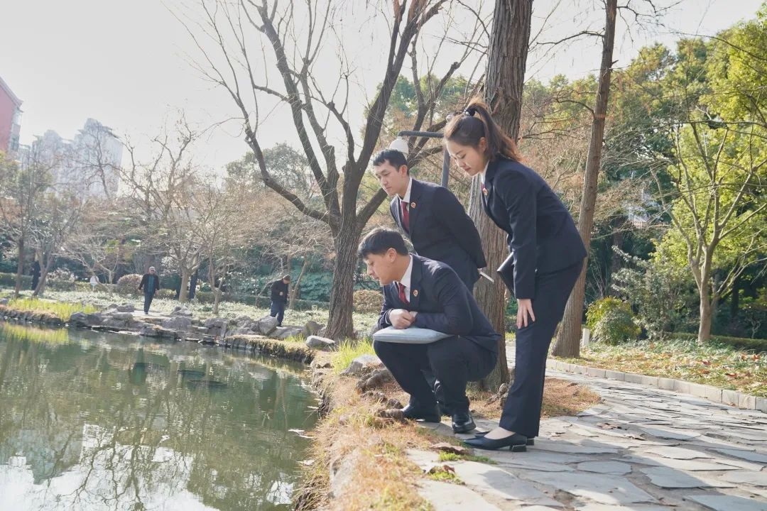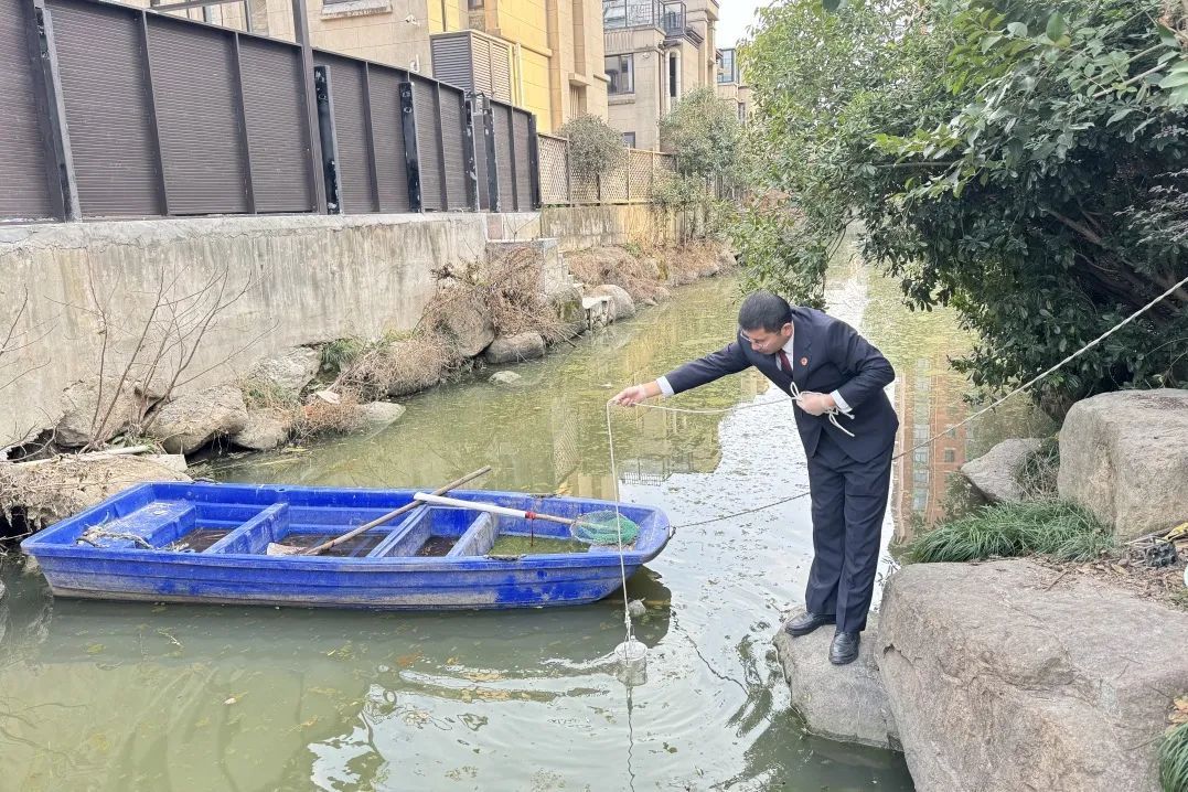 松江区检察院检察官就某河道水质异常行政公益诉讼案开展现场勘查,现场采样并对水质快速检测。