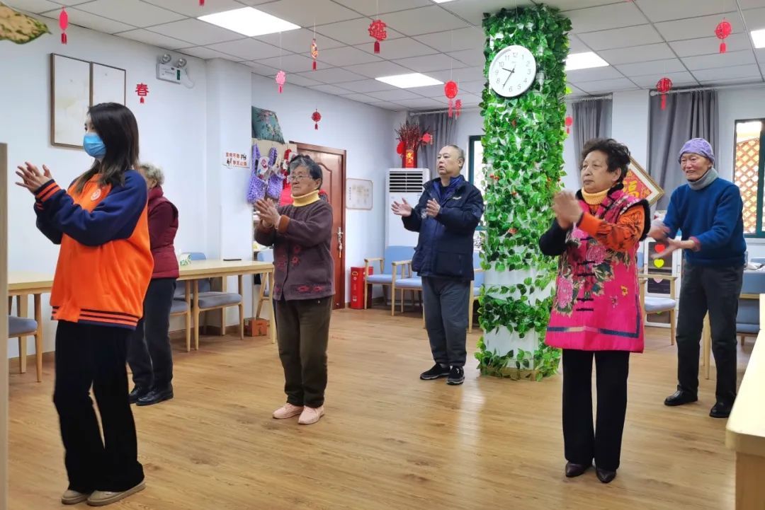 上午9点30分,紫云老年人日间照护中心的活动室内,日托老人们排着整齐的队伍,脸上洋溢着笑容,一起做着有趣的快乐拍打操。