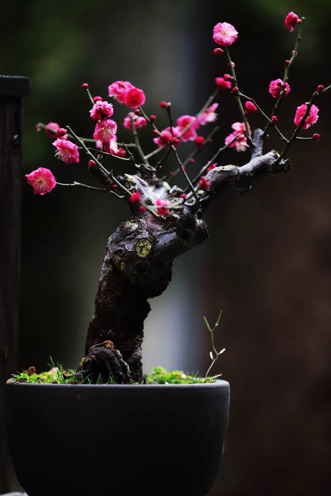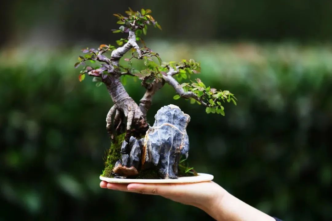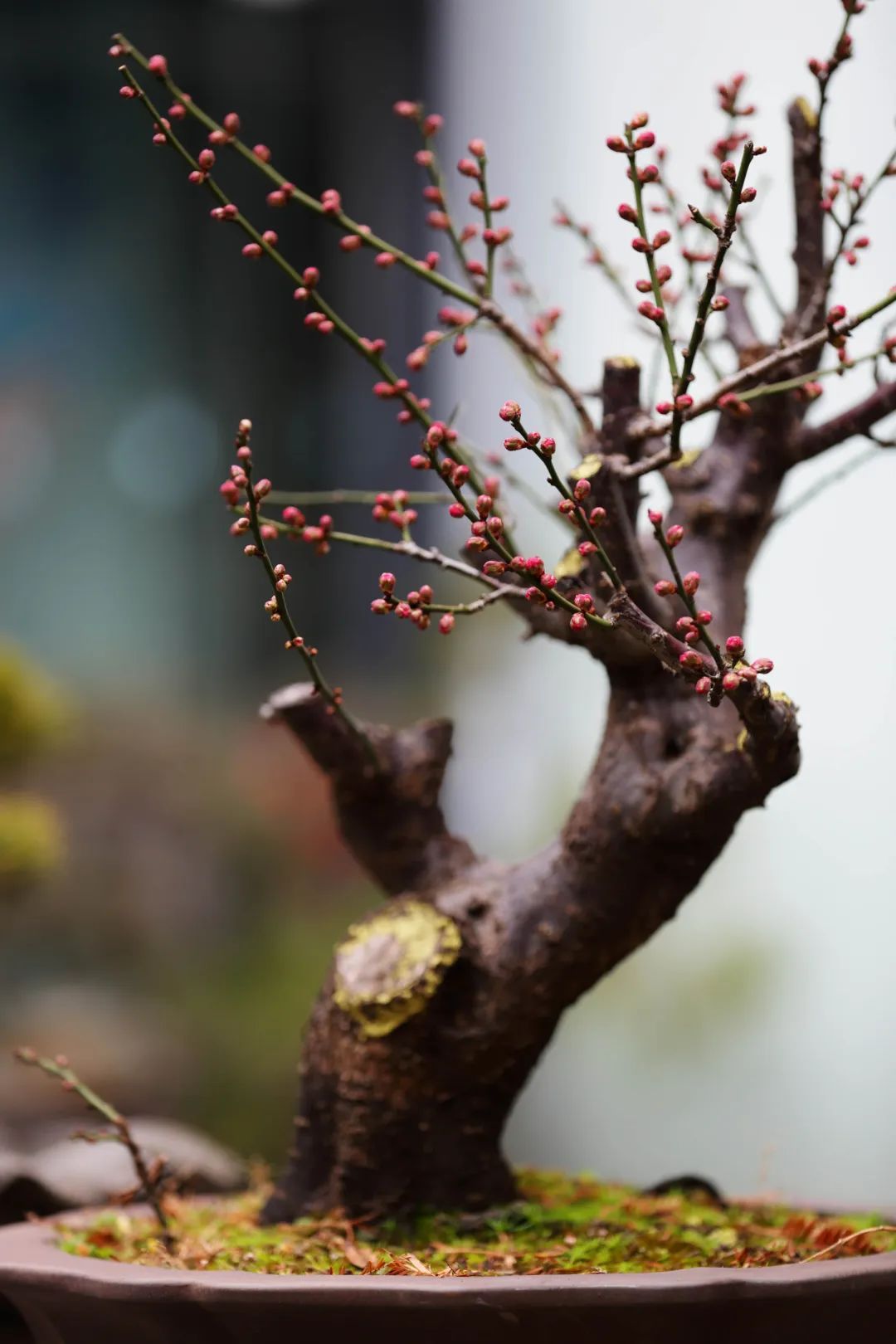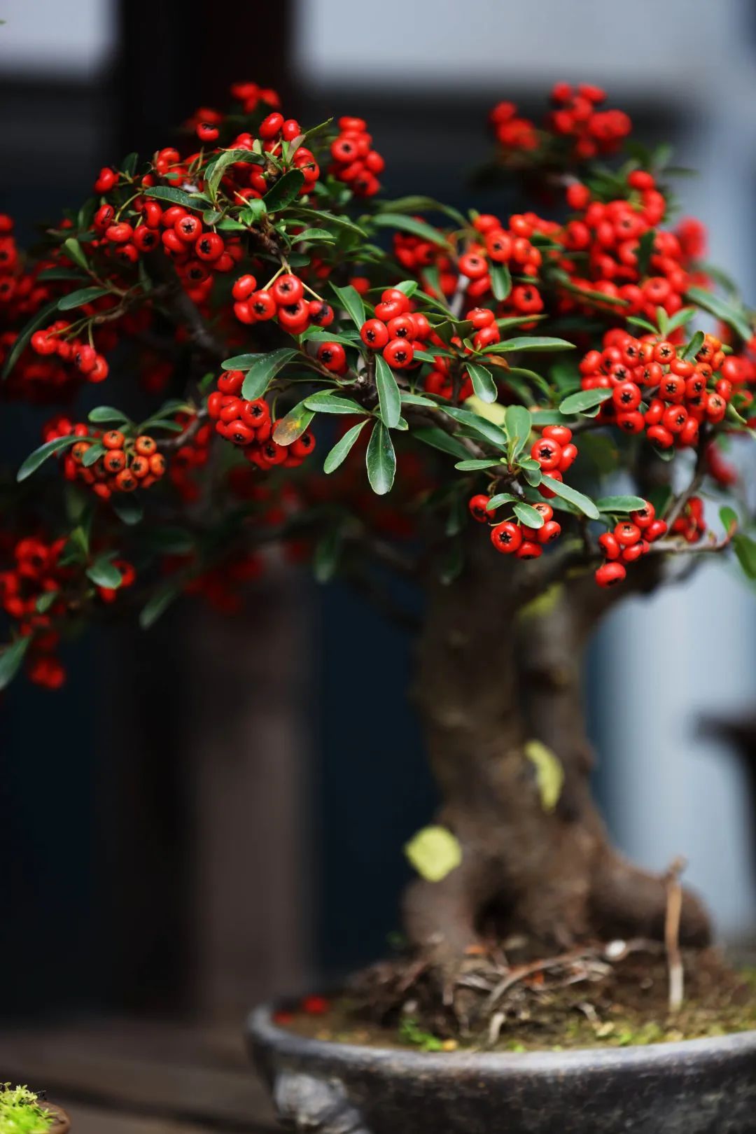 除了传统作品,花果盆景更是充满节日气息。红梅绽放,散发丝缕香气;枝头的金弹子,是绿色中最抢眼的一抹橙黄;累累的火棘,蕴含着对新一年的期待和祝福……蓬勃的春意,在咫尺盆中无限铺展。