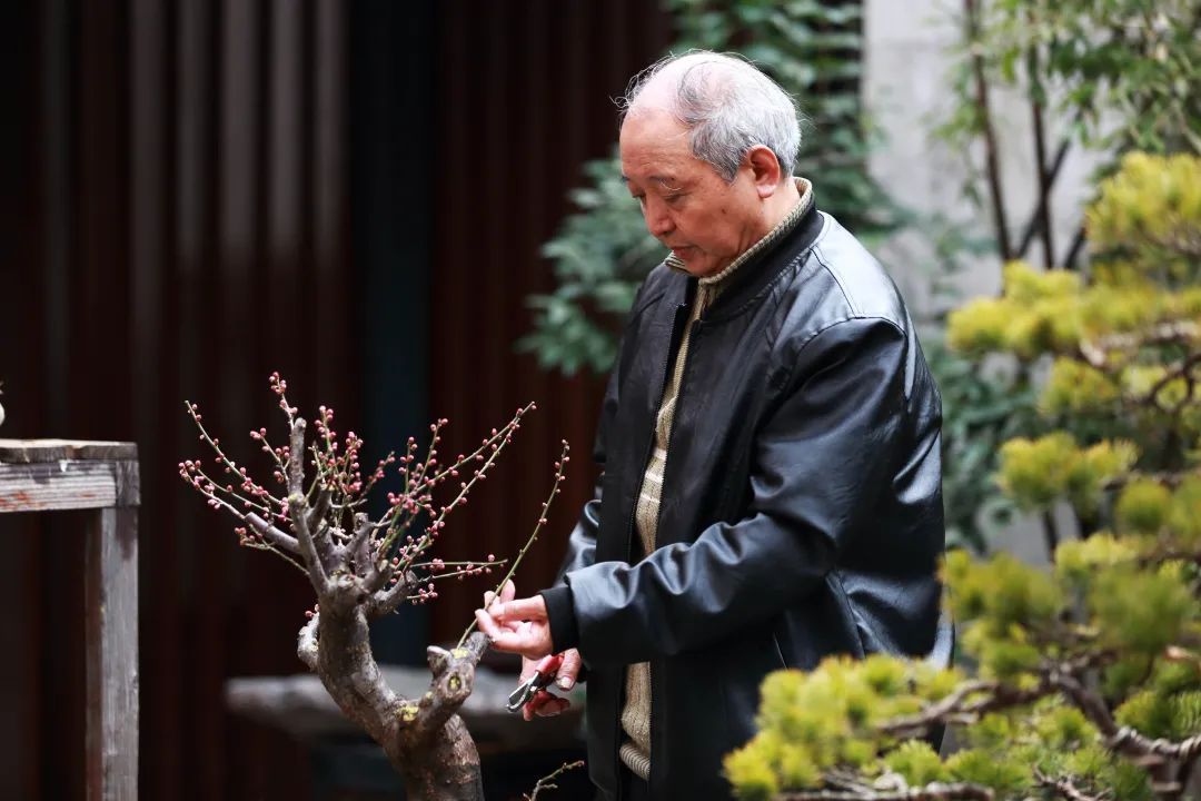 春节前后,嘉定盆景(盆树)技艺非物质文化遗产代表性传承人莫洪源格外忙碌,园内有近百件盆景作品需要养护。