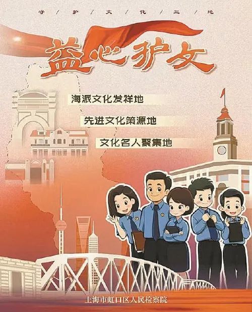 2024年7月,虹口区检察院出台《服务保障“文化三地”三年行动方案》,从历史文脉综合保护、海派文化创新发展、先进文化传承提升、名人文化活化汇聚、公共文化提质增效等五个方面综合履职,打造“四大检察”一体、执法司法联动、信息资源共享、多方聚力发展的检察履职新模式。