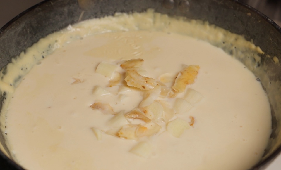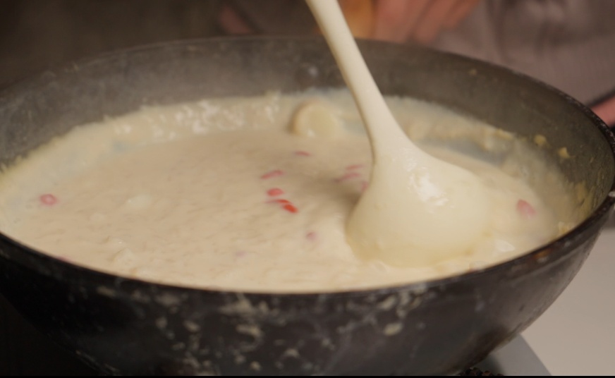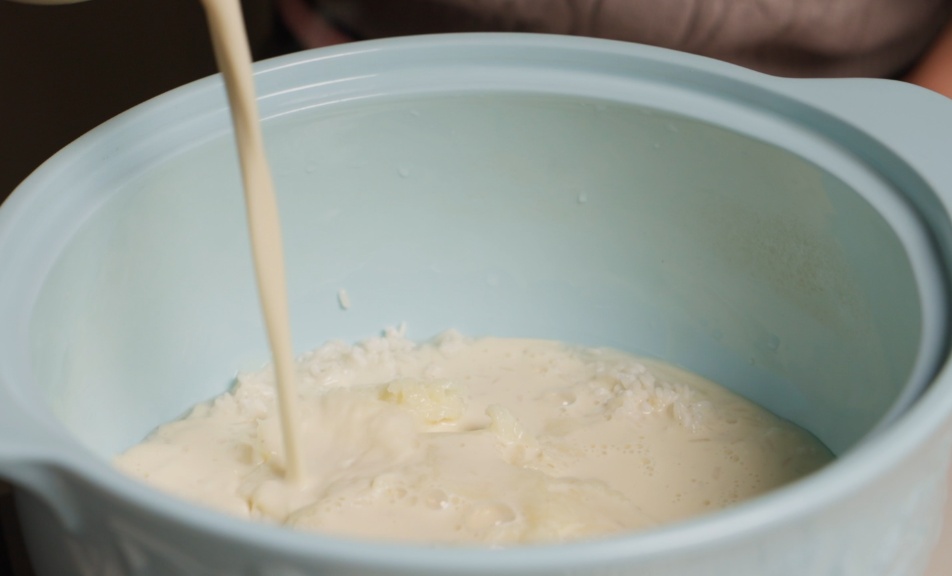3.锅中加入大米和糯米,把山药泥倒入,再倒入800毫升豆浆和400毫升清水,中火煮开后小火煮20分钟。