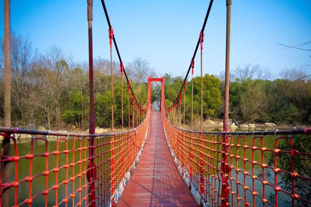 藏于绿色之中很显眼的红色吊桥