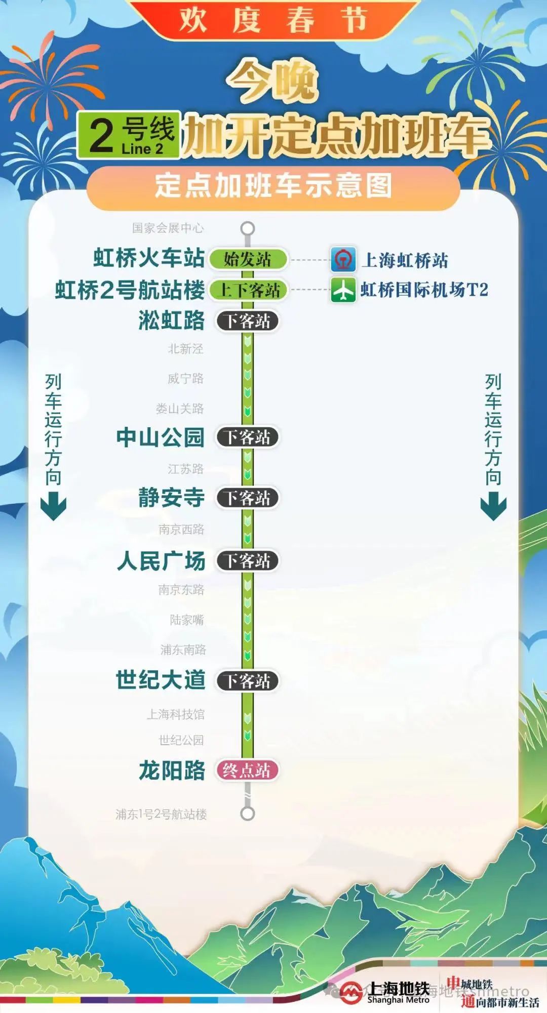 【2号线:虹桥火车站站往龙阳路站方向】在虹桥火车站站常态定点加班车(23:30)的基础上,往龙阳路站方向加开定点加班车至次日01:45。