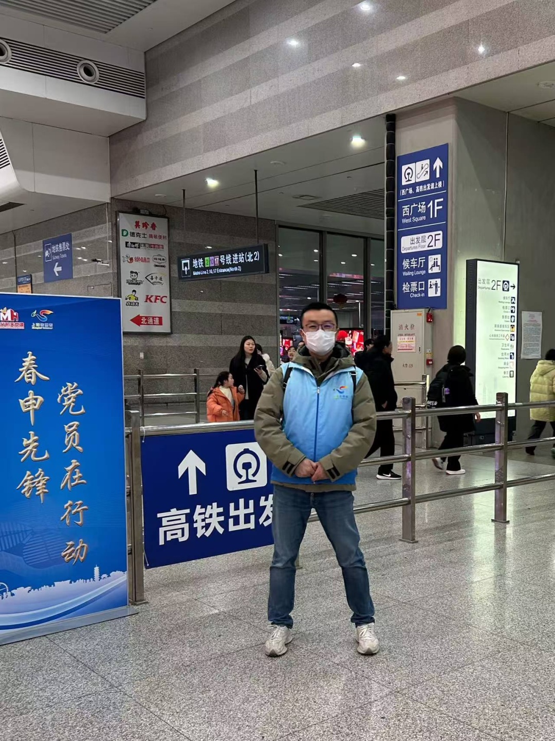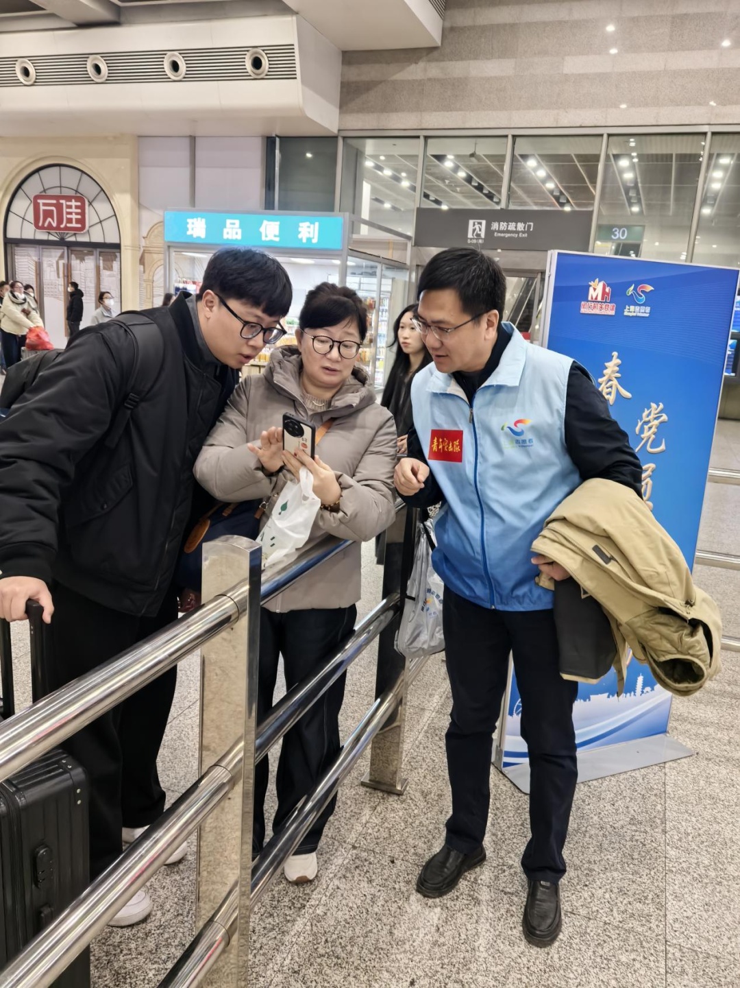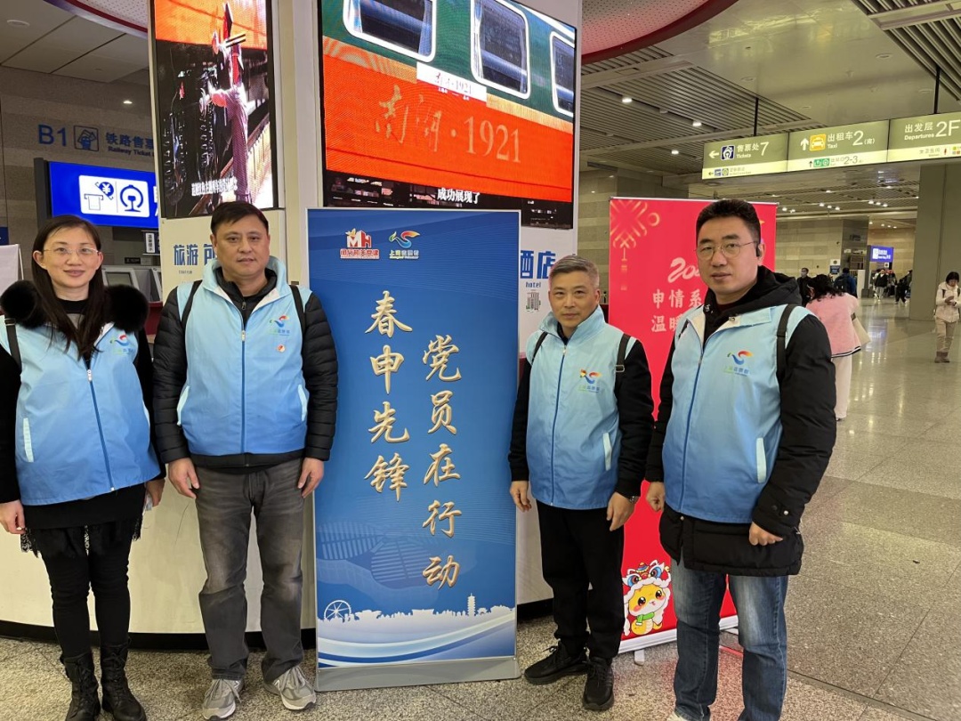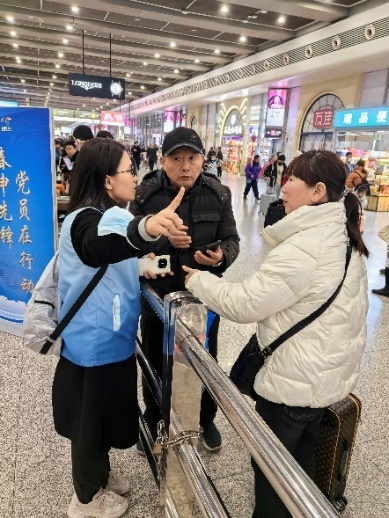 春运期间,闵行志愿者将坚守岗位,热忱接待,用他们的实际行动和满腔热情,温暖八方旅客。1月26日起,“今日闵行”“闵行组工”与区区级机关工作党委、区委社会工作部联合推出“春申先锋·党员在行动——春运志愿者手记”系列报道。在区区级机关工作党委号召下,区人大办党支部组织四名机关干部于2025年2月3日赴虹桥高铁枢纽站参加春运志愿服务活动,以别样方式迎接蛇年立春!小组所在的南3出口可以说是虹桥枢纽中的枢纽,前后左右分别对应着高铁出发扶梯、地铁进口闸机、出租车上站点,以及网约车、停车库、公交汽车站出发点,原地转个圈自己先头晕;好在大家成员分工明确,从熟悉点位到商定答复内容,很快就都能熟悉应对。赵澍颖表示从两位旅客的举止中深切感受到了身上这身蓝色马甲的“魅力”。一个是位姑娘。她挪着走到志愿者宣传百乐宝处蹲下,眉目痛苦说肚子疼,“我们没有止痛药,我把我随身未开封的矿泉水给了她,问她需不需要找医护人员,陪她到避风处,休息片刻后姑娘叫了车,临走前礼貌地谢谢我的水,谢刚才大家对她的热忱相助。”一个是位老外。他左右手推着三个大行李箱冲到志愿者面前,说着不像是英语的语言,翻译软件不管用;“我们从对方递过来的手机那一头语音中发现了关键词——‘上海浦东机场、出租车’;随后我们和他用英语单词确认、带着他直奔出租车候车点、关照出租车司机并送他上车离站。”