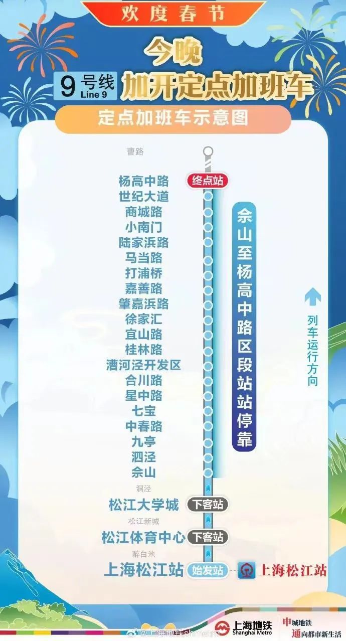 申通地铁集团介绍,为集中运送铁路夜间抵沪客流,2月7日晚,地铁9号线上海松江站站在常态末班车(22:30)后,往杨高中路站方向加开定点加班车至23:45。