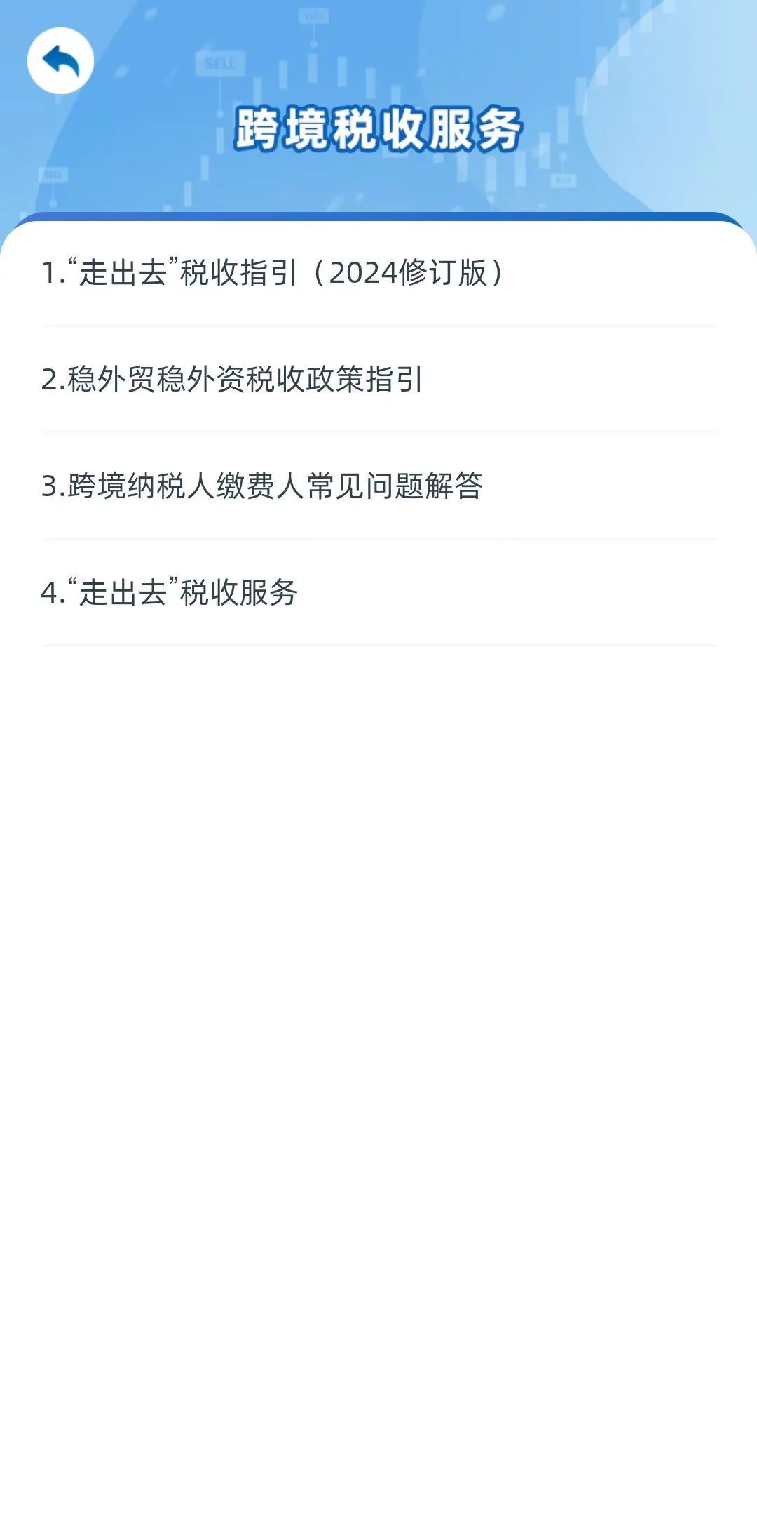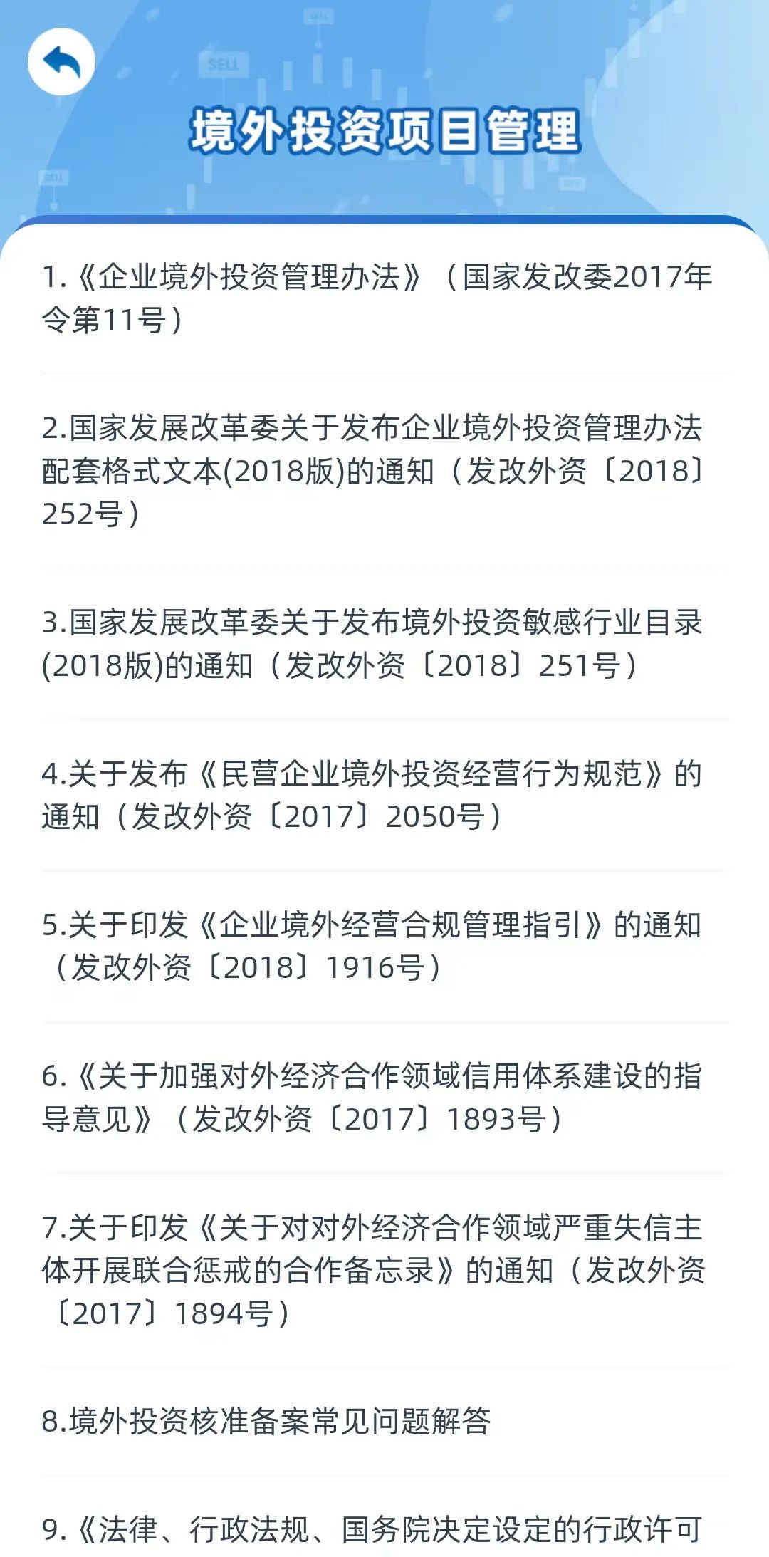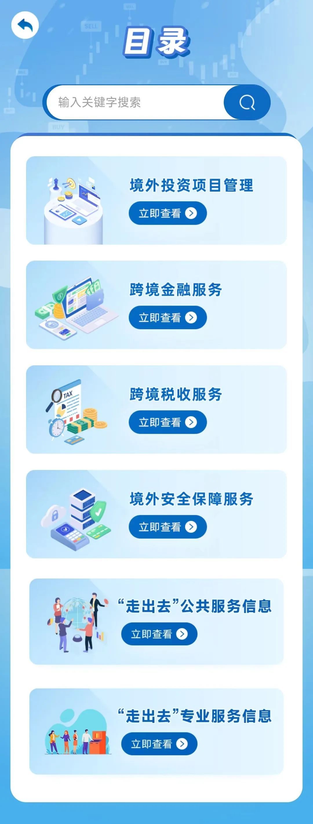 “走出去”政策服务包:该服务包汇编了境外投资项目管理、跨境金融服务、跨境税收服务、境外安全保障服务、“走出去”公共服务信息、“走出去”专业服务信息等六方面的主要政策文件,方便“走出去”企业随时掌上查阅,了解境外投资相关政策。