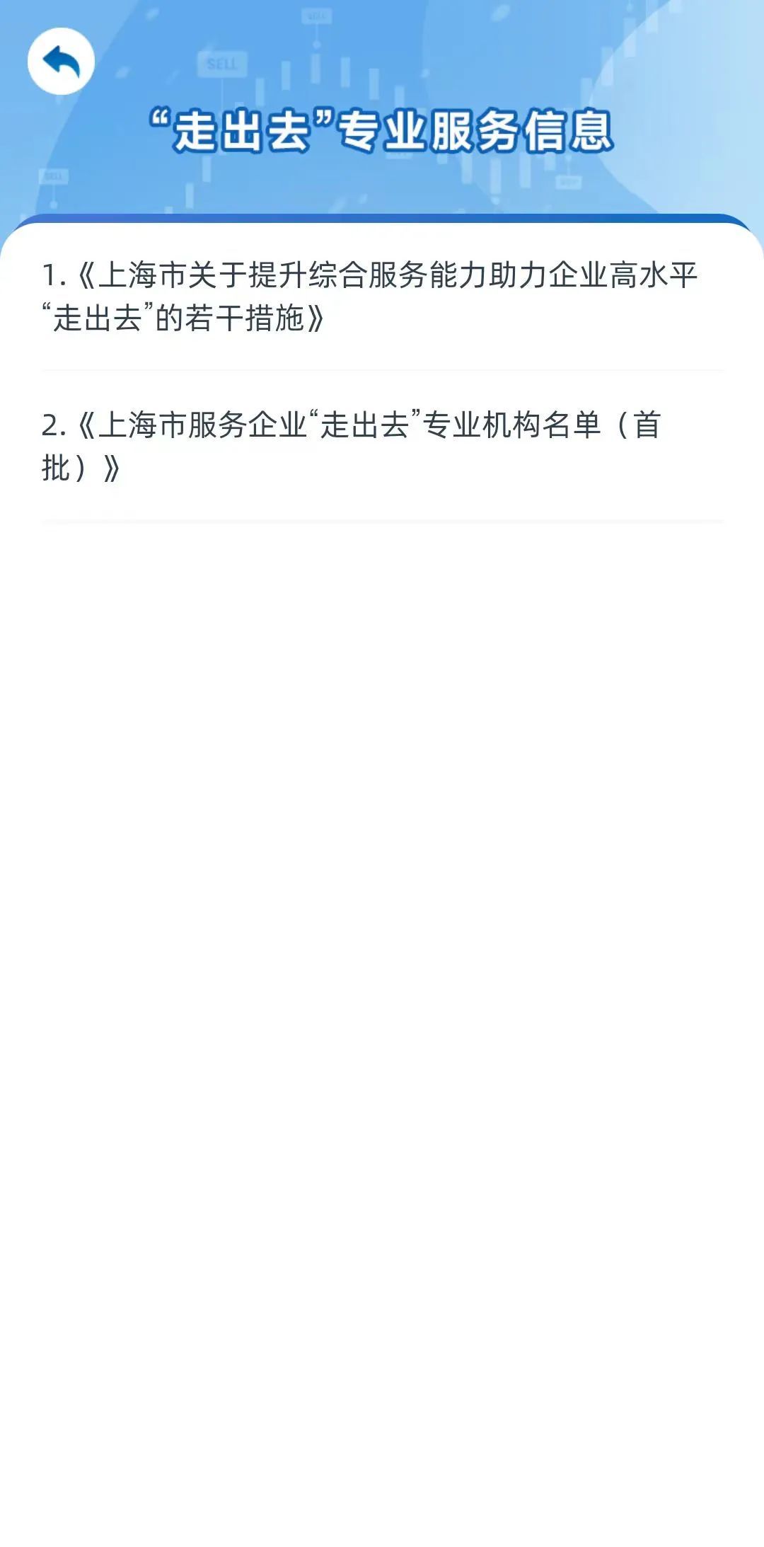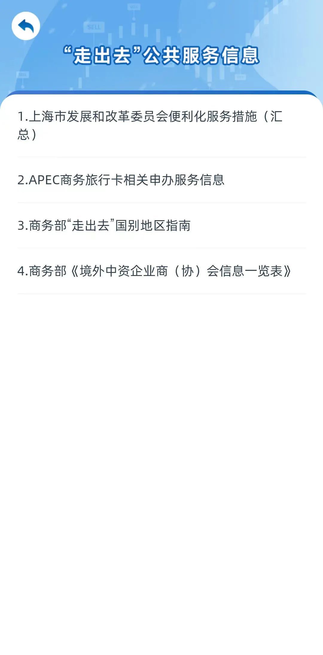 市发展改革委介绍,为进一步契合企业“走出去”服务需求,促进更多惠企政策信息直达出海企业,现全新推出“走出去”政策服务包2.0版本,并已在“丝路e启行”小程序同步上线。升级后的服务包将原有的四大模块拓展为六大模块,新增了企业比较关心的上海市APEC商务旅行卡相关申办服务信息等“走出去”公共服务信息和上海市服务企业“走出去”专业机构名单(首批)等“走出去”专业服务信息,同时对原四大模块内容进行了迭代,特别增加了“走出去”税收服务等政策信息,服务企业高水平“走出去”,推动我市境外投资高质量发展。详见↓
