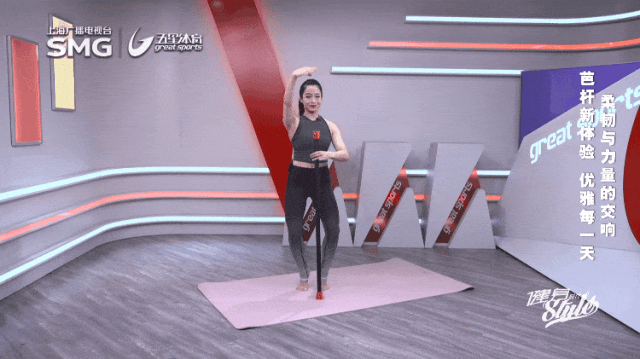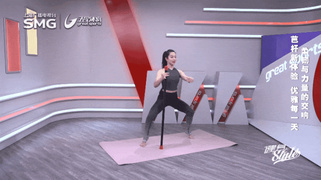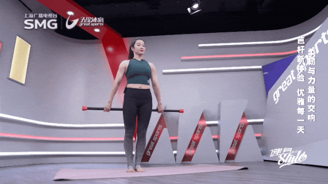 动作要点:将芭杆垂直于地面,手握在胸前,脚后跟并拢,脚尖向外一个拳头的距离,脚后跟依次抬高,先抬左脚脚后跟,再抬右脚脚后跟,左脚脚后跟落地,右脚脚后跟落地。当我们下肢稳定了,加上一些上肢,单手扶杆,微微弯曲手肘,前平举至身体前,至头顶,打开至肩膀位置,落下。每组完成20次,做2组。这个动作可以训练我们的脚踝稳定性,脚趾力量,小腿耐力。