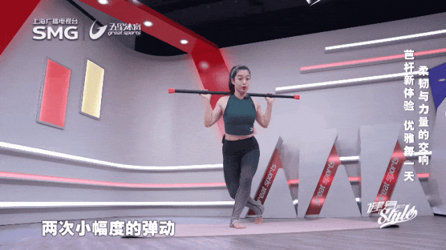 动作要点:将芭杆垂直于地面,单手扶杆,放在身侧,双脚脚后跟并拢,脚尖向外一个拳头的距离,右脚向斜后方迈一大步,脚趾和膝盖指向前脚脚后跟,支撑脚保持微屈,右脚保持向后向前迈一小步、小幅度点地。这个动作每边2组,每组小幅度弹动30次。感受支撑脚臀部外侧慢慢发酸。通过臀部不同角度的训练,增加臀部不同角度下的发力感,让臀部更饱满。