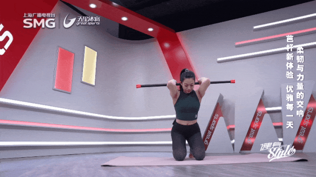 动作要点:双脚与髋同宽,脚趾踩地,跪于地面,双手与肩同宽,正握芭杆,举过头顶。臀部往后坐靠近脚后跟的同时,弯曲手肘,手肘夹紧耳朵将芭杆靠近后脑勺,做三头弯举,臀部往前回到膝盖和肩膀中间,手臂伸直向上举过头顶。这个动作做两组,每组完成20次。这个动作可以增强上下肢的协调,塑形手臂线条,伸髋的动作模式,增加臀部力量。