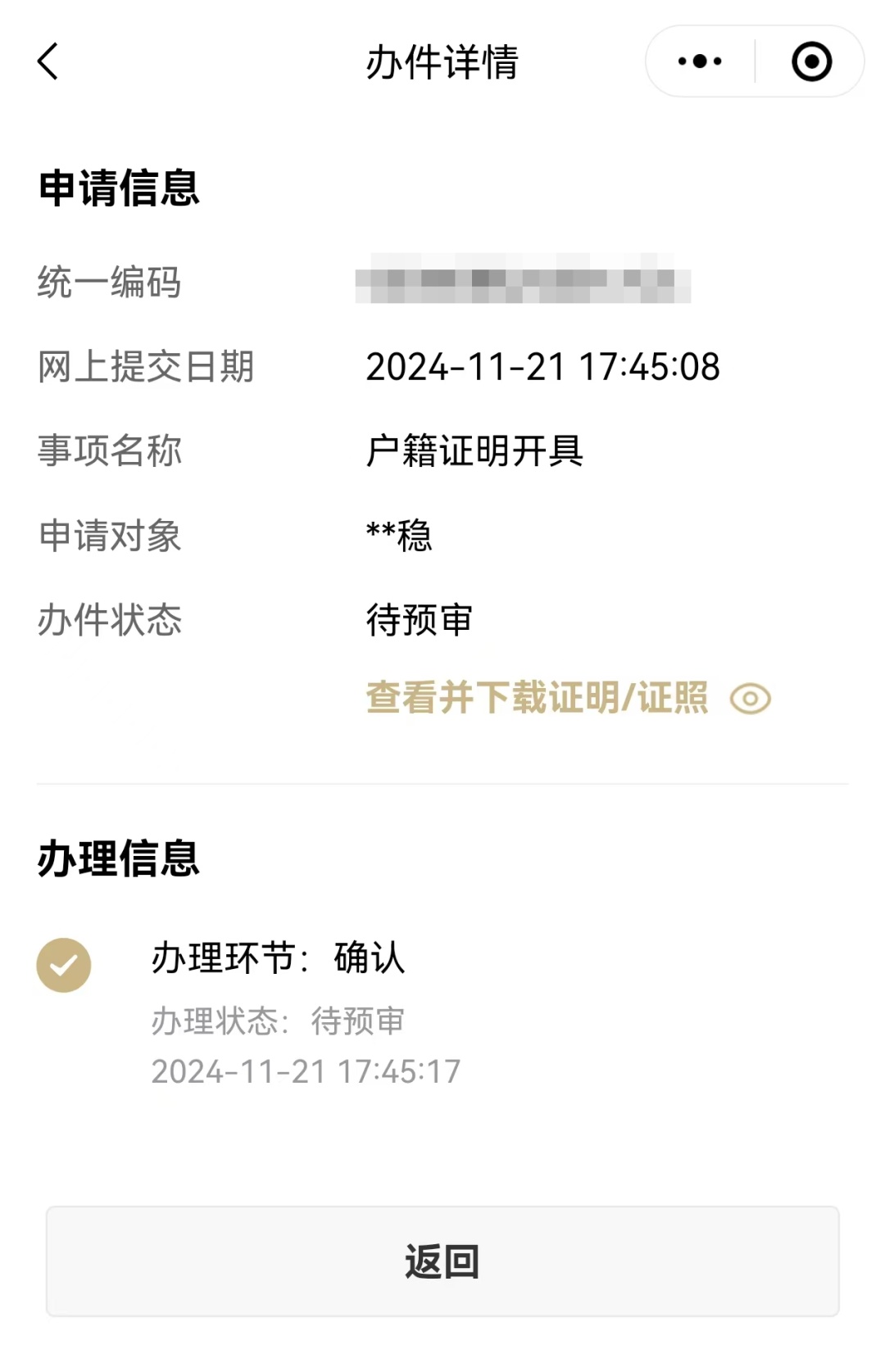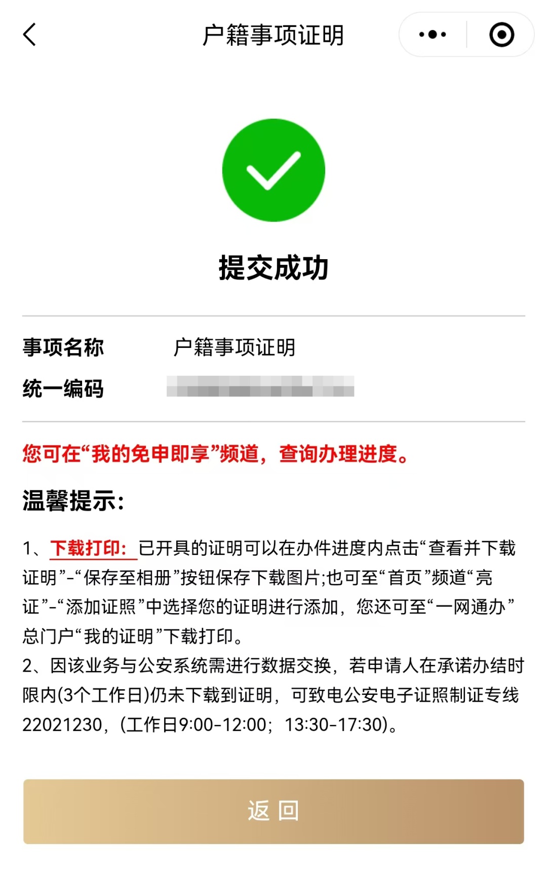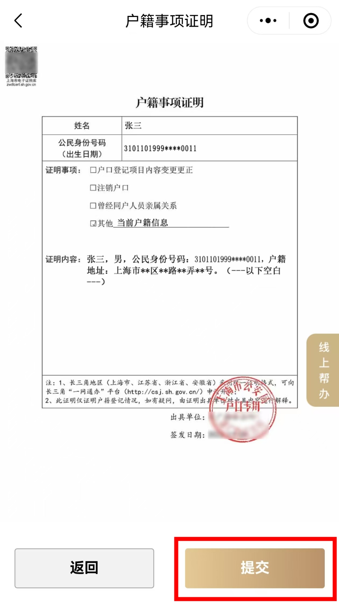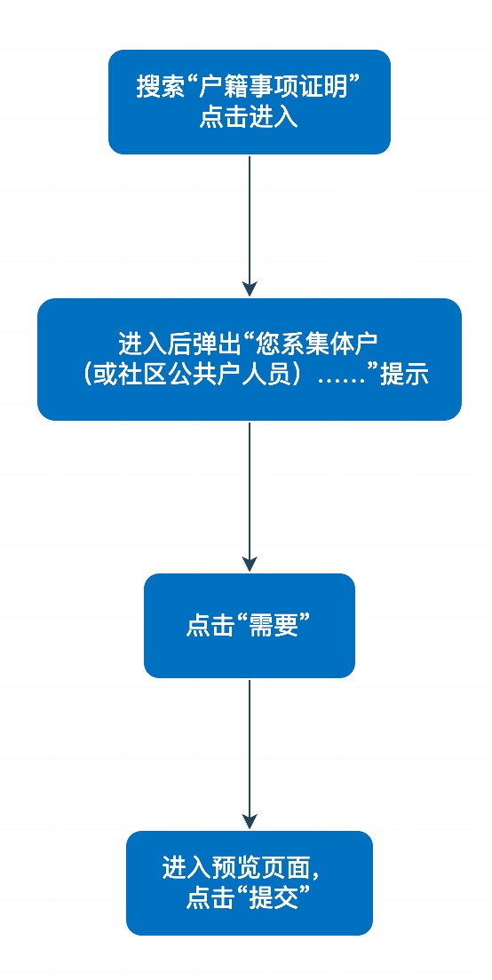 1、申请人员范围:本市学生集体户、单位集体户、社区公共户人员。 2、出具证明内容:申请人姓名、性别、公民身份号码、户籍地址等当前户籍信息。 3、证明出具时限:申请提交后原则上在60分钟内开具。 4、证明查看下载:申请人可在“随申办”APP“我的免申即享”频道查询办理进度;并可在“我的免申即享”频道查看下载证明;或在“亮证”频道“添加证照”-“户籍证明”查看下载证明。 流程示例(以“随申办”APP为例):