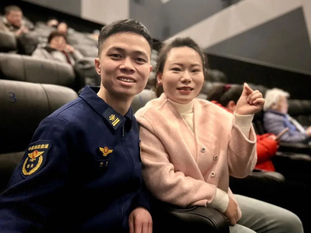 在观影人群中,记者还发现了一对甜蜜的情侣。这是虹口消防救援站消防员杨朔在春节假期坚守岗位的第六年,今年
