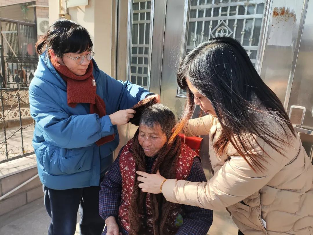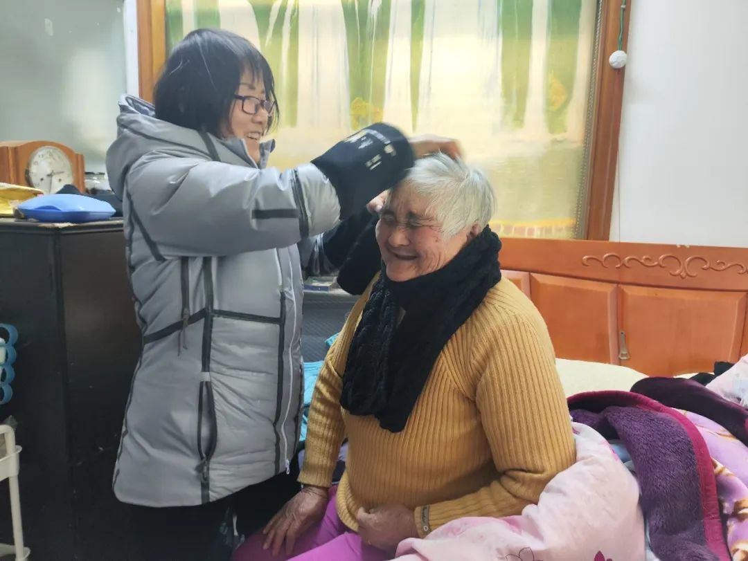 吴正英老人双目失明,尽管有老伴戴师傅常伴左右,日常生活还是存在诸多不便。当老人戴上崭新的帽子和围巾,双手不自觉地轻轻摸了摸,脸上洋溢着笑容:“真暖和,就是不晓得我戴着好看伐?”一旁的戴师傅赶忙夸赞:“侬戴勒老好看额,漂亮!”
