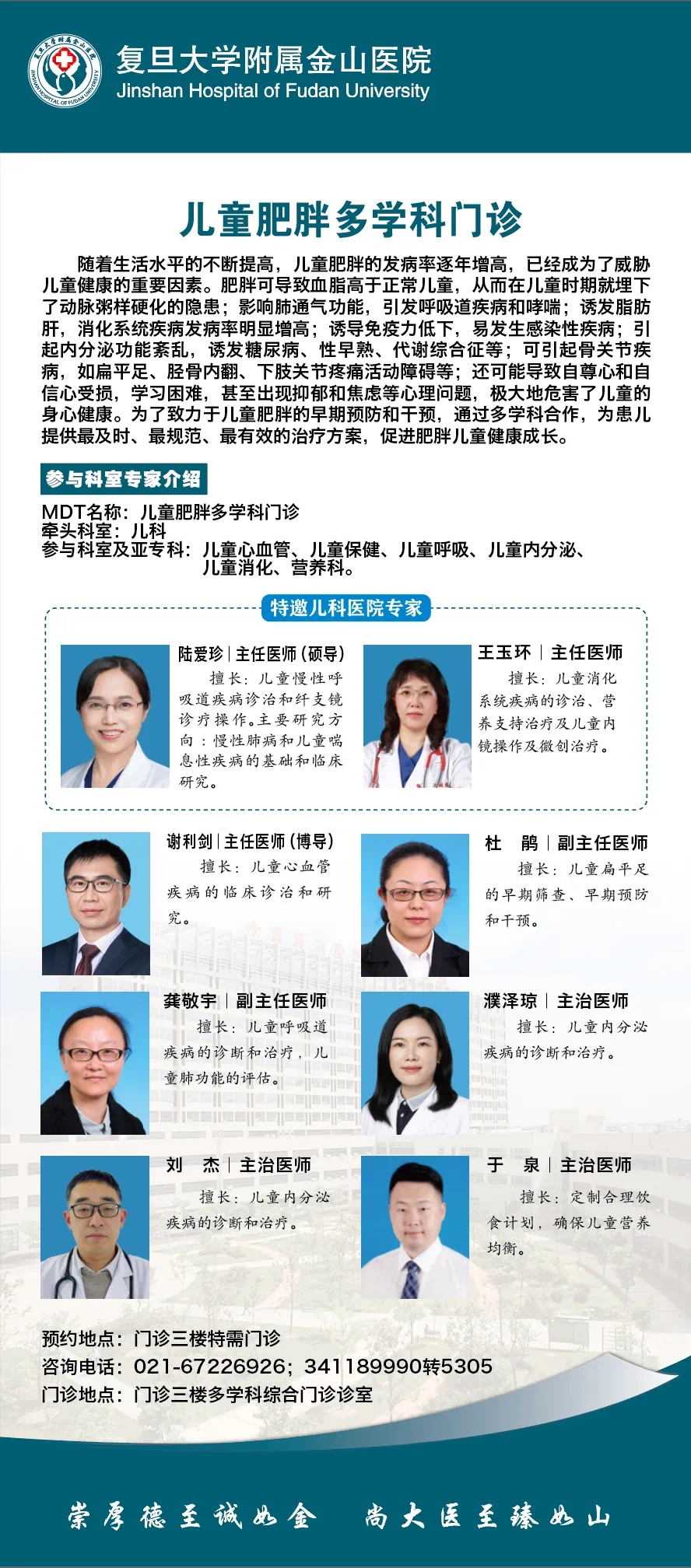 别担心,复旦大学附属金山医院新组建的——儿童肥胖多学科诊疗(MDT)门诊来啦!经过前期筹备,金山医院整合院内、院外学科、亚专科及专家资源,在区内开设首个儿童多学科门诊,为“小胖墩”的健康提供一站式服务。