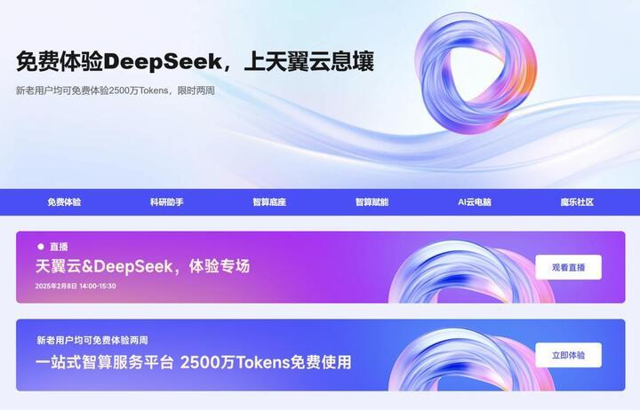 登录天翼云官网(https://www.ctyun.cn),进入“息壤”智算平台专题页,即可立即体验一站式智算服务平台。江苏电信可提供至高DeepSeek-R1 671B满血版API接口,2500万Tokens免费使用!